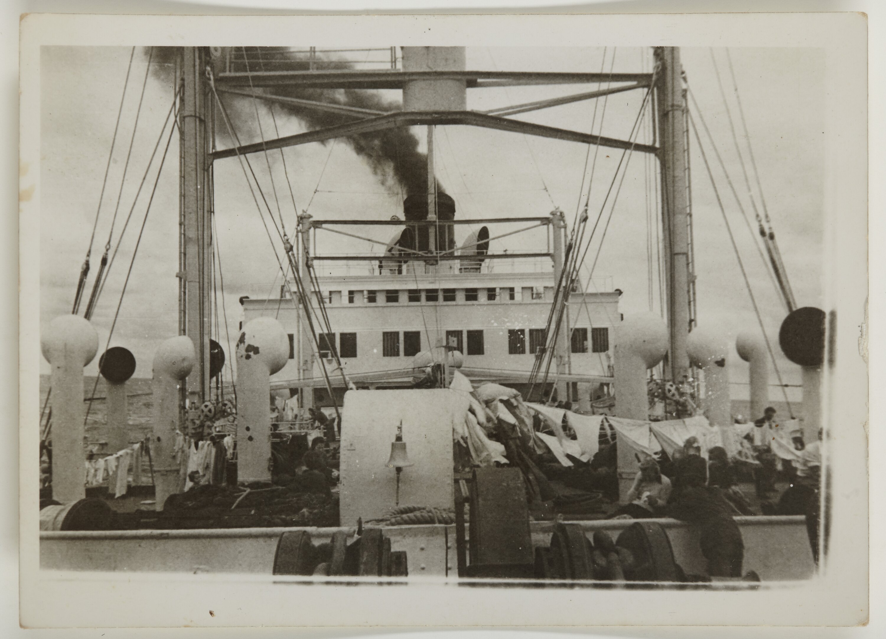 Black and white photograph showing the ship Protea at sea in 1950. It is part of a collection which documents the migration experience of Juliana Brzozovski and her daughter Mathilde Bauer. They migrated to Australia from Germany via Munich Resettlement Centre in 1950, and arrived in Melbourne aboard the Protea on 9 December 1950. Although born in Germany Juliana was married to a Latvian, most likely Stanislaus Brzozovski who migrated with them.