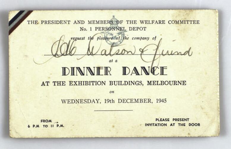 Invitation issued to Leading Aircraftman (LAC) Watson and friend for a dinner dance at the Exhibition Building on Wednesday 19 December 1945 from 6pm to 11pm. The dinner dance was held by the President and Members of the Welfare Committee of the No. 1 Personnel Depot of the RAAF.