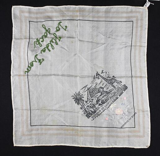 Finely woven silk handkerchief inscribed 'Souvenir of Egypt'. Belonged to Mrs Hilda Beattie of Warrnambool, whose brother John served in World War I and sent this handkerchief to her during the War.
