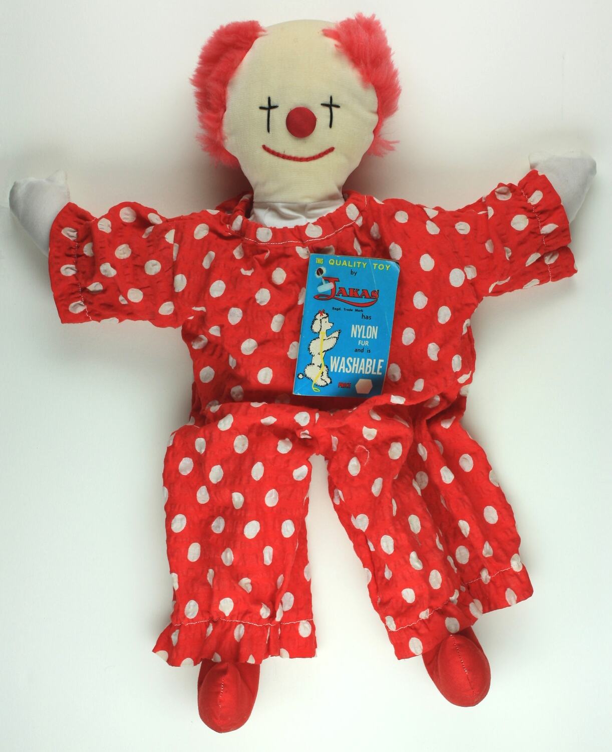 Thin and floppy toy clown made from white cotton material with red material for shoes and dressed in a loose fitting red seersucker jumpsuit with white polkadots. Its head is made from a cream coloured felt material with two hand-stitched black crosses as eyes, a red material button for a nose and a mouth hand sewn in chain-stitch in red cotton. It has pink fluff as hair on either side of its face and around the back of the head with a bald patch on top of the head. There is a small catalogue booklet attached to the body of the clown with a plastic joiner. There is no 'Jakas Toys' label stitched onto this soft toy.
