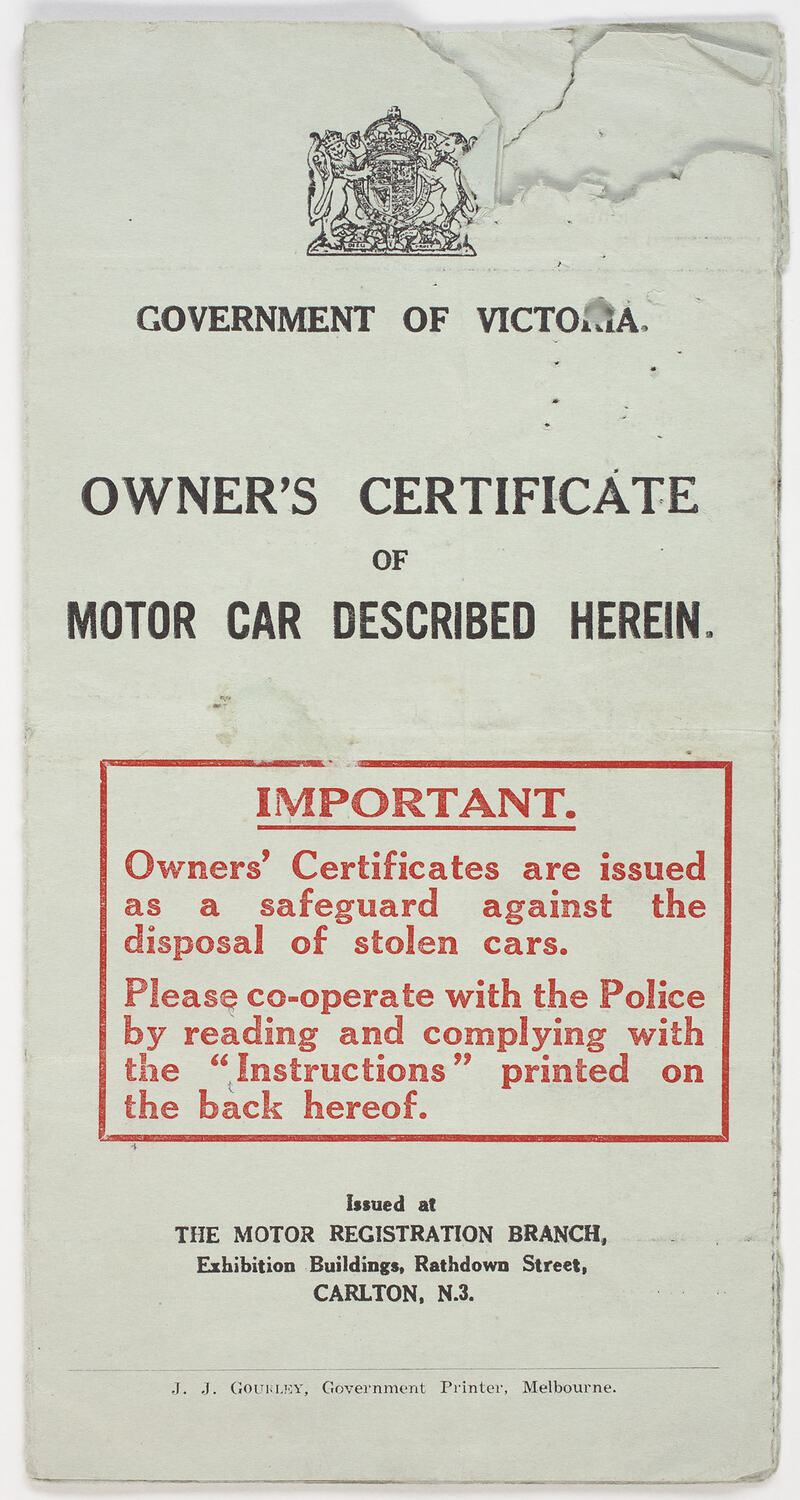 Text: GOVERNMENT OF VICTORIA/OWNER'S CERTIFICATE/OF/MOTOR CAR DESCRIBED HEREIN./IMPORTANT./Owner's Certificates are issued/as a safeguard against the/disposal of stolen cars./Please co-operate with the Police/by reading and complying with/the Instructions printed on/the back hereof./Issued at/THE MOTOR REGISTRATION BRANCH/Exhibition Buildings, Rathdown Street,/CARLTON, N.3.