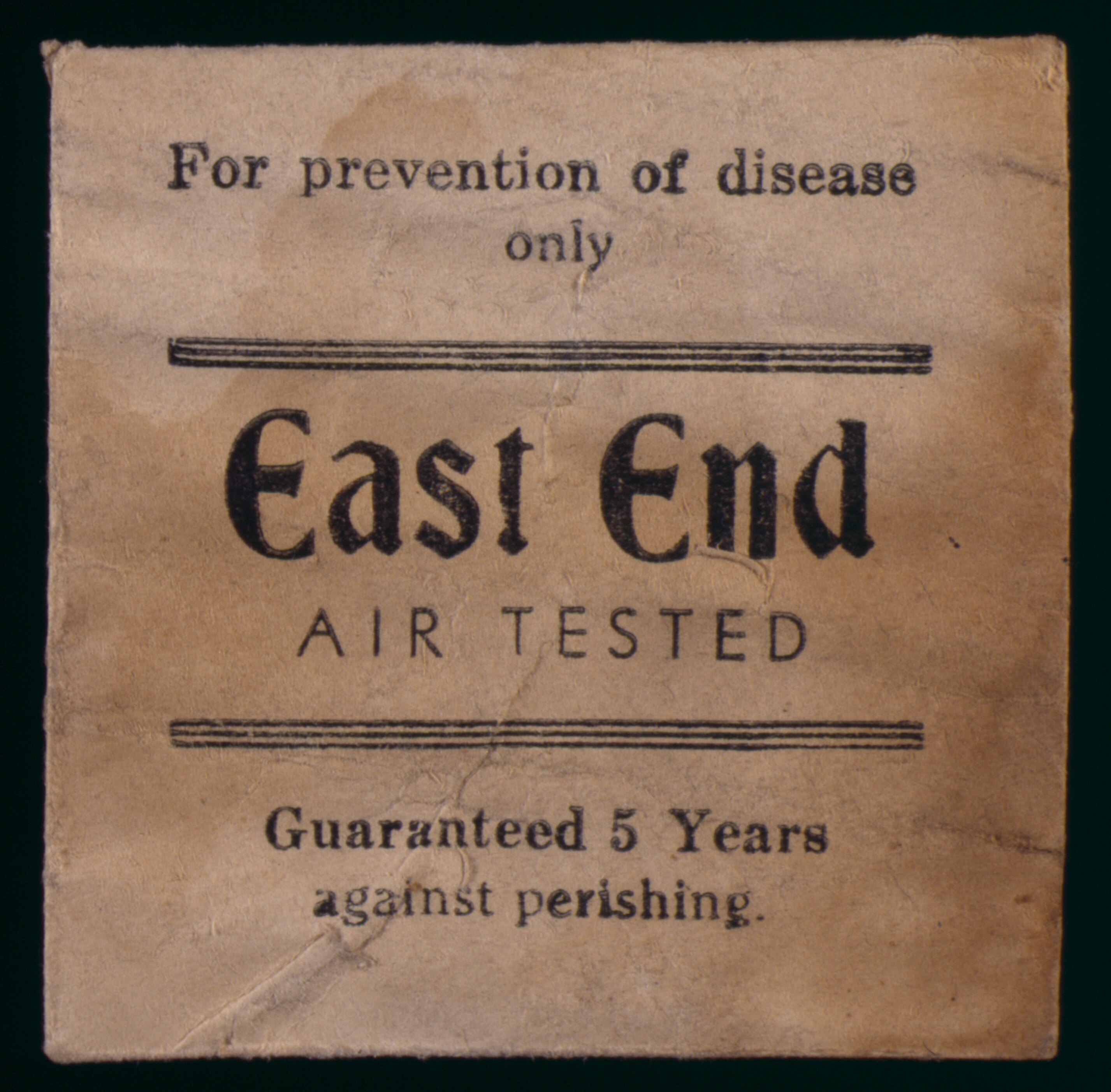 Paper condom packet. Off white paper with black printing. East End brand, with thin black lines running horizontally above and below brand name.