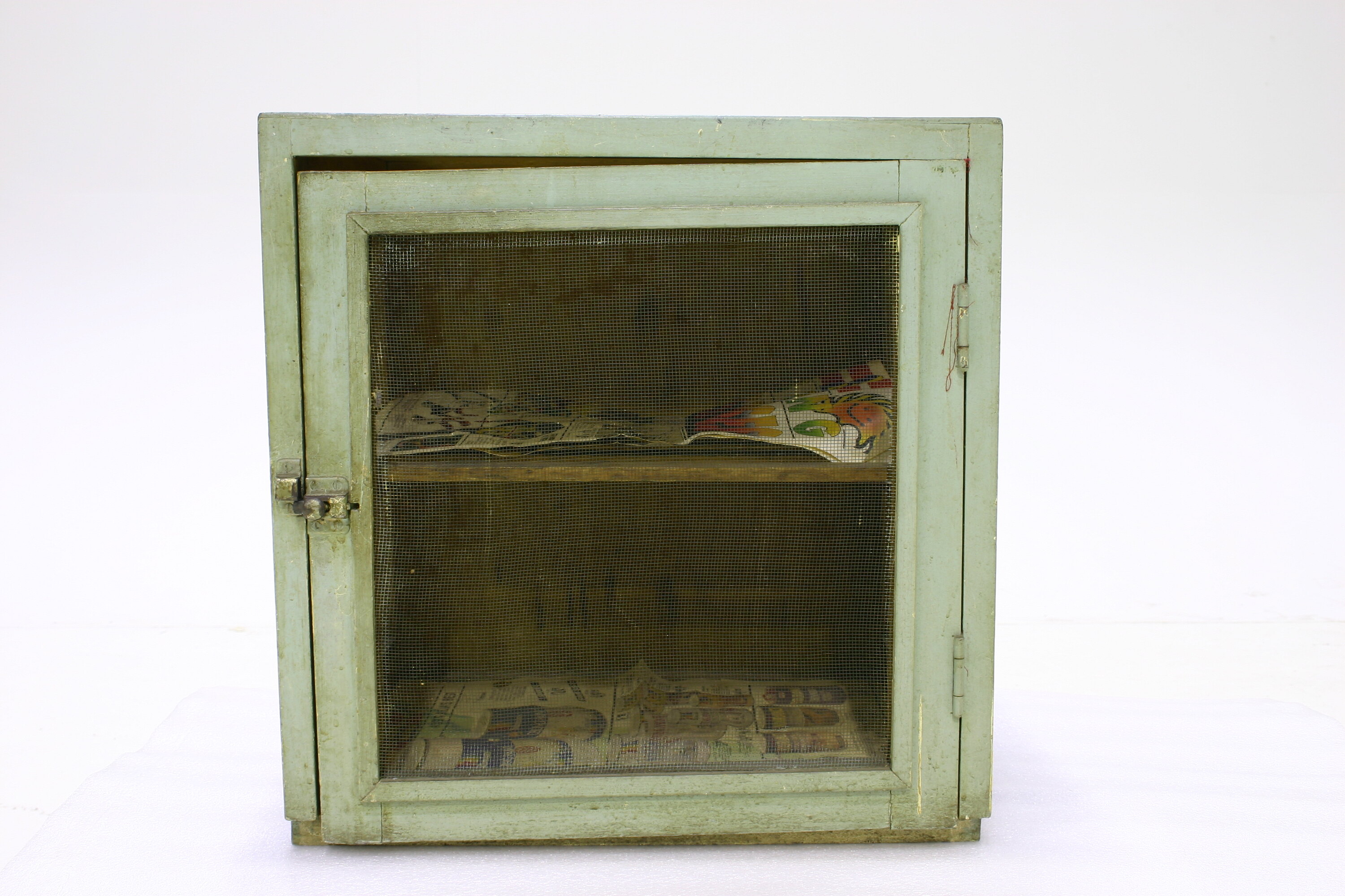 A box shape, wood and wire mesh food safe, painted blue. FRONT and SIDES: wire mesh attached to wooden frame, wooden panels covering tacks. DOOR - 2 hinges at right. Spring action lock middle left. HANDLE - knob, middle left. BACK: single panel, painted blue. INTERIOR: unpainted. Shelf at middle made of 5 wooden slats. Shelf and base covered in pieces of newspaper, from 1990.