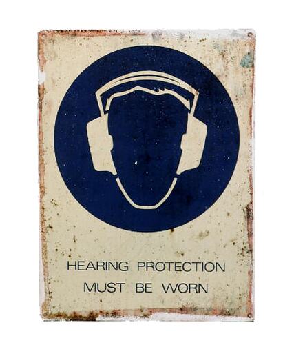 Hearing protection sign made circa 1961-1980 and used at P.M.A. (Pigment Manufacturers of Australia) Laverton, Victoria, Australia, circa 1961-1990.