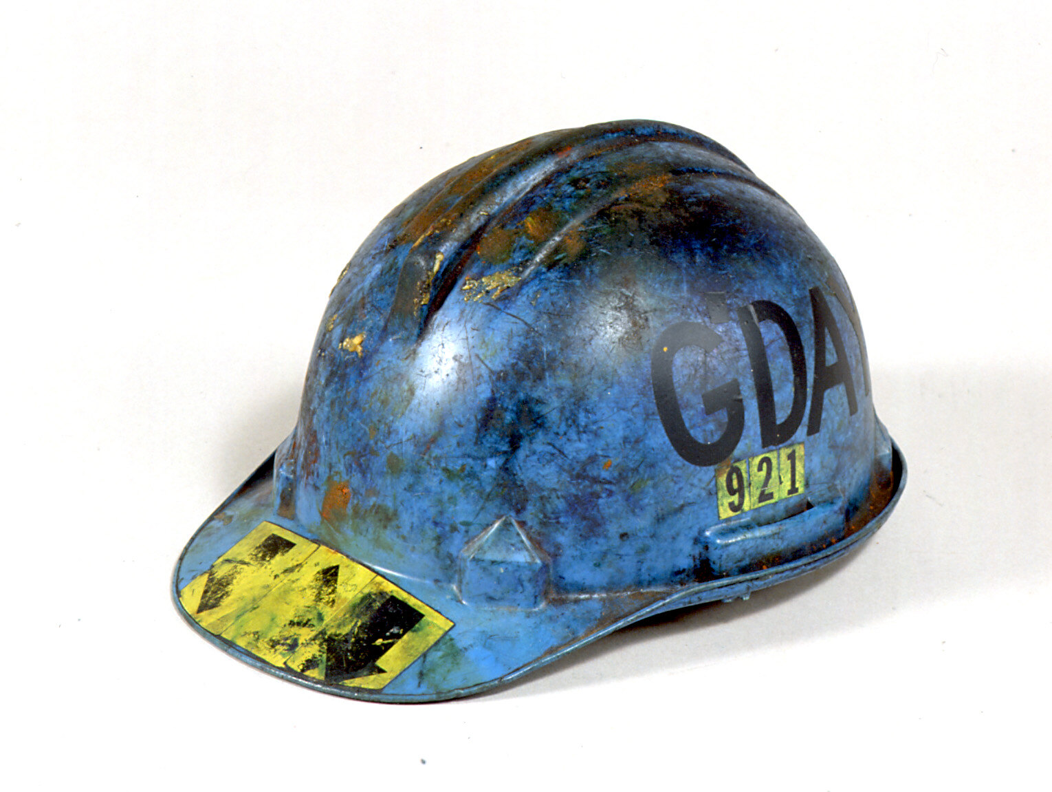 Blue plastic helmet with front fixed visor. Yellow and black stickers on exterior. The scuffed yellow sticker on the visor has black arrrows. Opaque plastic head fitting attached inside. Three grey ribbons across inside of hat.