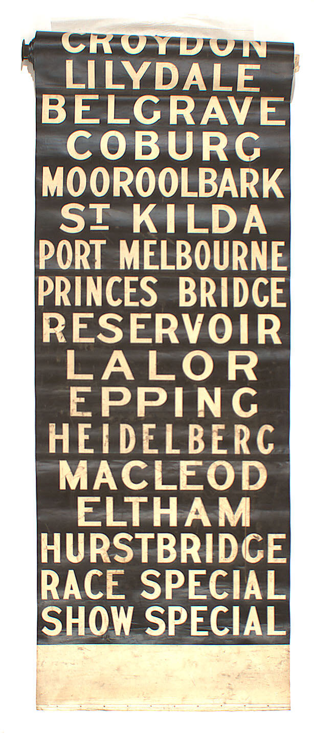 53 destinations or terminal stations used on the Melbourne electric suburban train network are listed on the blind as follows: "SPECIAL / WERRIBEE / MOORABBIN / CHELTENHAM / BERWICK / MORDIALLOC / ASPENDALE / CARRUM / FRANKSTON / OAKLEIGH / DANDENONG / FLINDERS STREET / SPENCER STREET / NEWPORT / NEWPORT WORKSHOPS / COWRIE / WILLIAMSTOWN / WILLIAMSTOWN PIER / ALTONA / SUNSHINE / ST ALBANS / PAKENHAM / ESSENDON / BROADMEADOWS / BRIGHTON BEACH / SANDRINGHAM / CITY LOOP / GLEN WAVERLEY / KEON PARK / ALAMEIN / CAMBERWELL / BOX HILL / UPFIELD / GREENSBOROUGH / RINGWOOD / UPPER F.T. GULLY / CROYDON / LILYDALE / BELGRAVE / COBURG / MOOROOLBARK / ST KILDA / PORT MELBOURNE / PRINCES BRIDGE / RESERVOIR / LALOR / EPPING / HEIDELBERG / MACLEOD / ELTHAM / HURSTBRIDGE / RACE SPECIAL / SHOW SPECIAL"