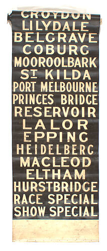 Train destination blind, black background and white text in English for Melbourne/Victorian stations. Train destination blind is attached to a wooden scroll with circular metal ends. The destination blinds were used on Melbourne suburban electric trains from 1919, with 3 blinds to every 7 carriages. The destination signs were mounted on the front of the driver's compartment on all motor cars and driving trailer cars.