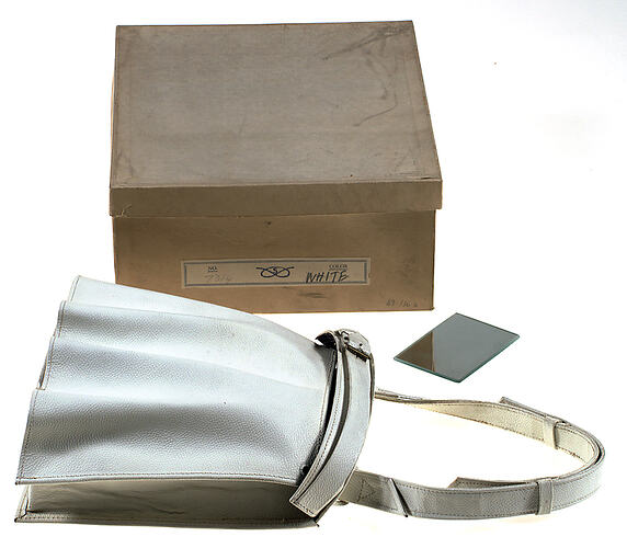 1 Ladies white leather skirt style handbag with dark blue poplin moire lining. Strap handle. Buckle and strap decoration on lid. .2 Hand mirror in pocket of bag. .3 Box lid. .4 Box with Simpsons label reading No. 7314 (logo).