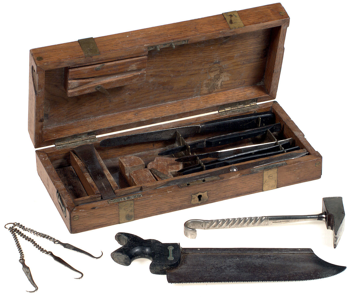 Hinged wooden box with lid fastened to base by two brass hinges. Some instruments are missing. Instruments include: short metal saw with a wooden handle; metal knife with black bone handle; metal scapel; metal hammer-like instrument; two small scapels; knife with metal handle; hinged instrument with sharp ends; metal instrument; three interlinked chains with three hooks. The box has a compartments for each instrument. It is lockable although the key is missing.