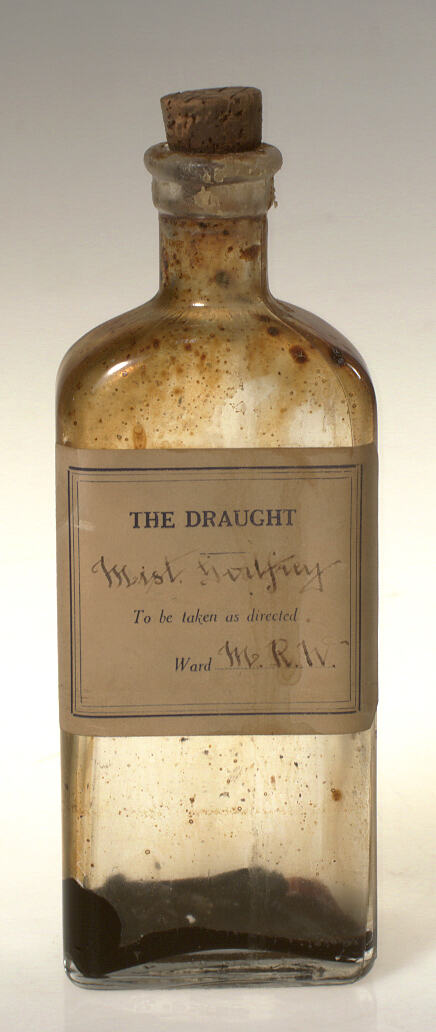 THE DRAUGHT/Mist.Godfrey/to be taken as directed/Ward MRW - printed label with writing in faded ink on front of bottle