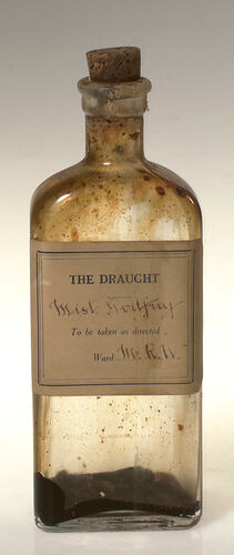Bottle of Godfrey's Mixture used in the pharmacy of a mental health hospital in Victoria Australia circa 1860. It contained laudenum (an opiate) and treacle and was used as a sedative.