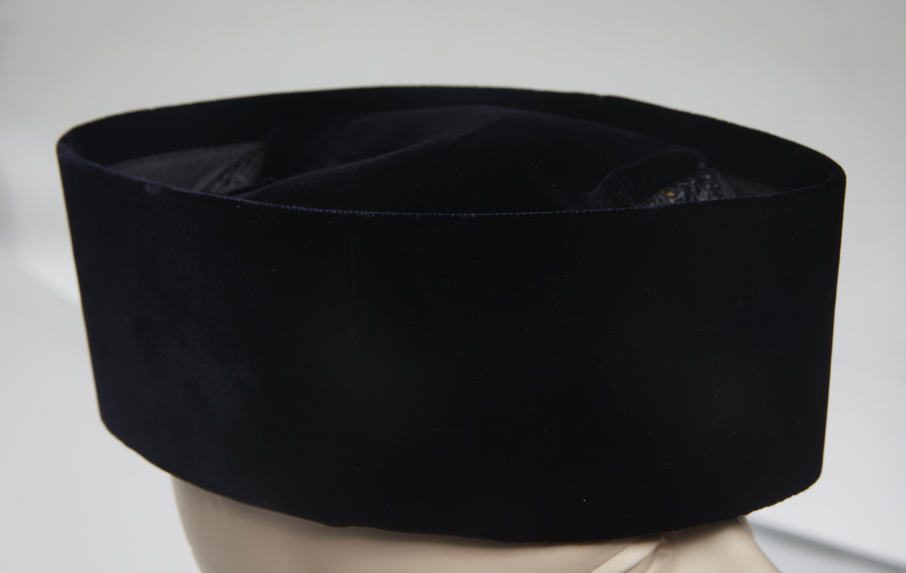 Black velour kopiah with stiffened sides and soft cap with embroidered eyelet at centre. Edge of the fabric is embroidered in a decorative wave pattern in white, pale brown, blue and black embroidery thread. Elliptical design with points at front and back. Lined in polyester and cotton.