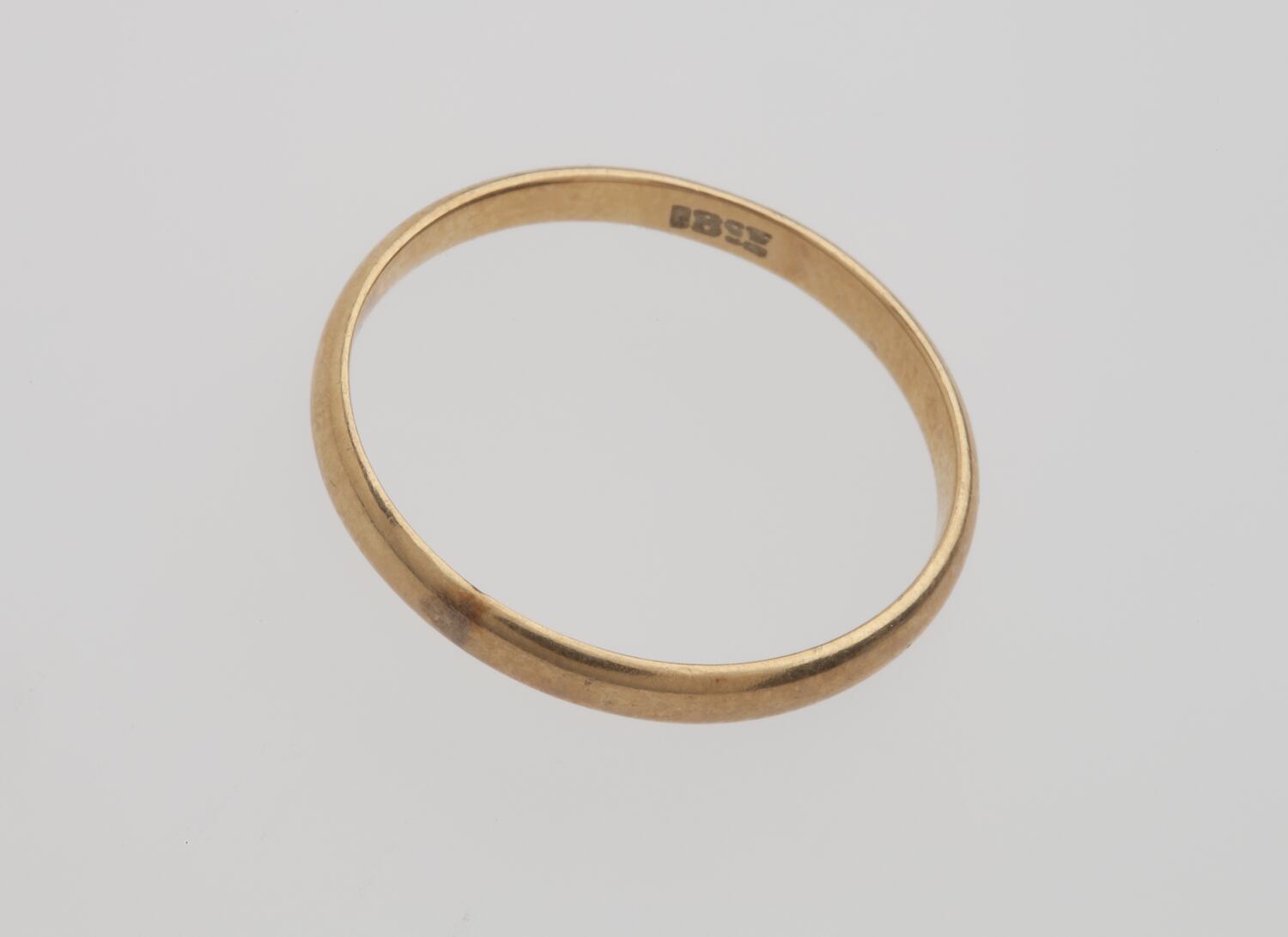 Plain gold wedding ring. Thin. Stamp on inside. No other markings.