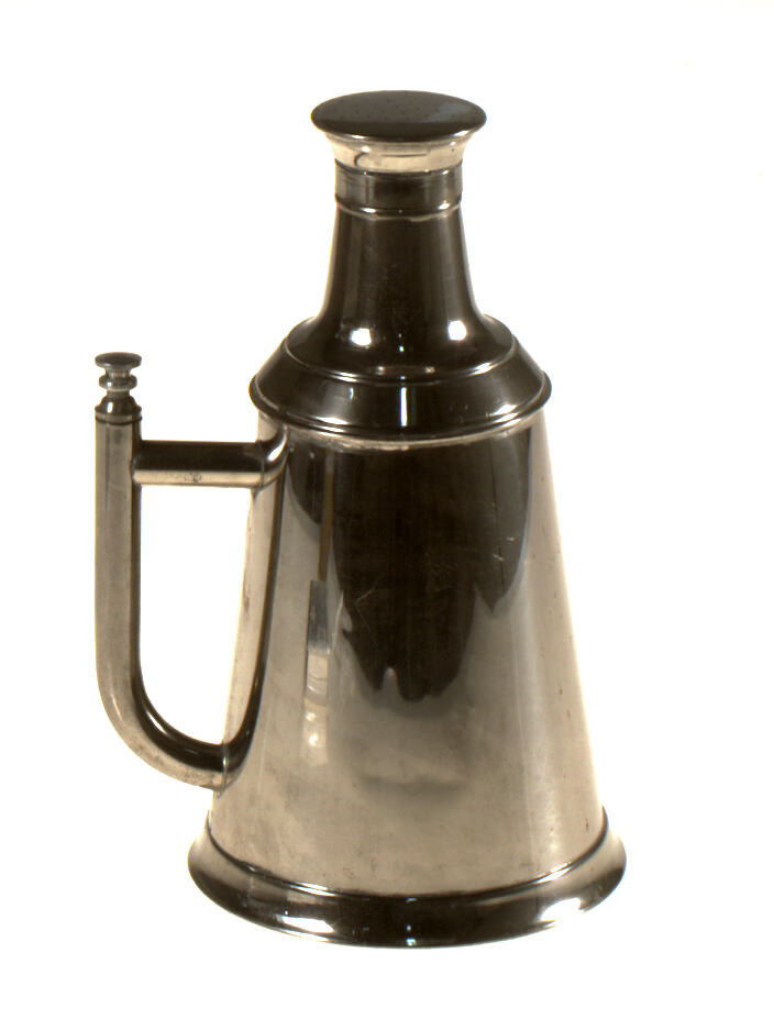 Rounded metal jug with flat base, tapered neck and screww-on lid with perforated top. Curved handle to one side.