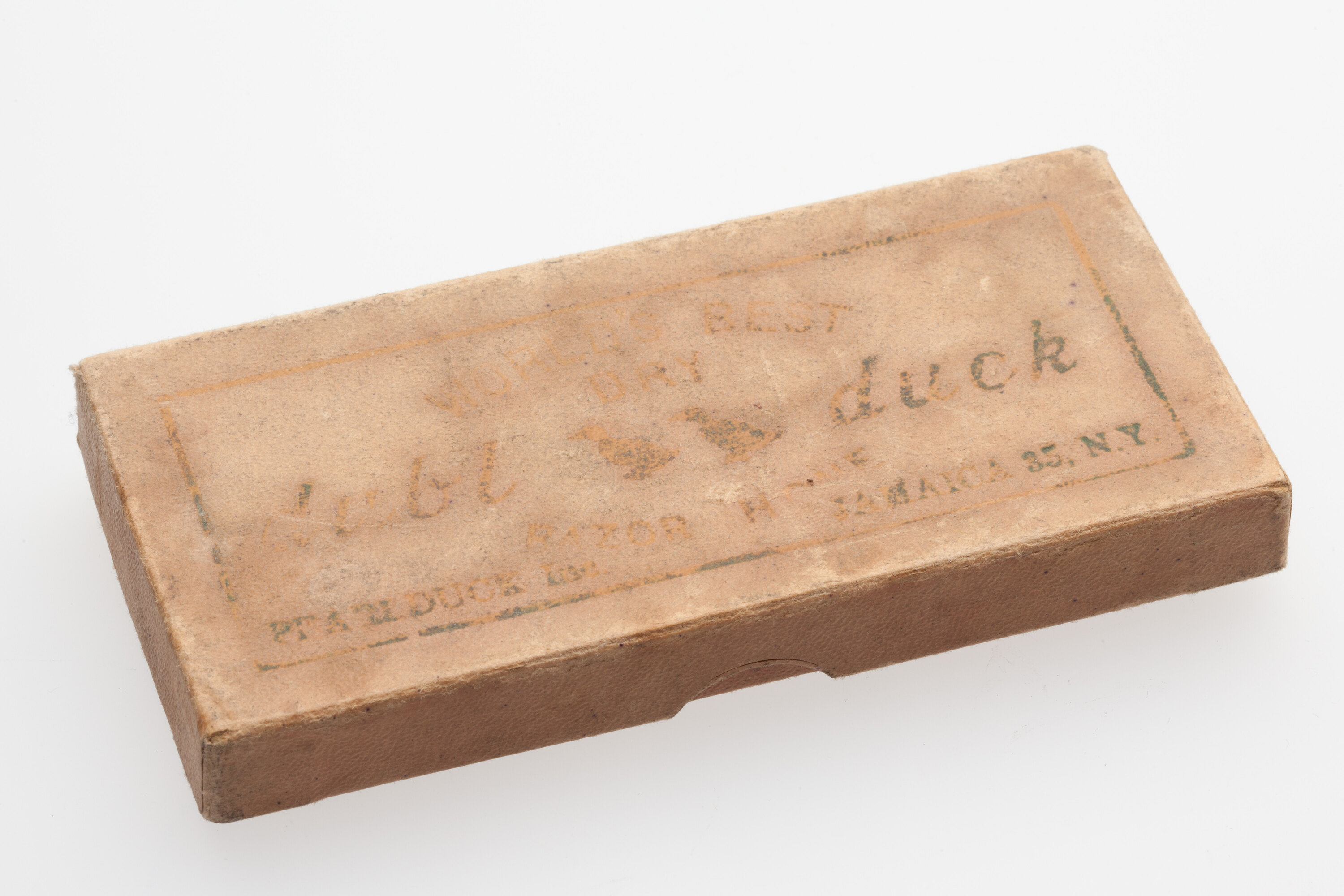 Inscription on box lid worn and difficult to read but appears to be: dubl duck with two duck motifs in between. Stone: 'world's best dubl duck/dry hone'