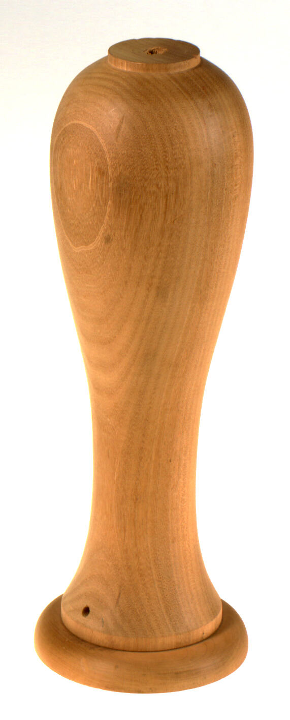 Lamp base made from gold-coloured wood with very pronounced circular grain. Body is shaped like a baseball bat set upon a circular, rounded platform. These are two separate pieces of wood that have been glued together. A disc-shaped form rests above the body and has a hollow vertical channel bored into its centre for the electrical cord to enter and pass through body of lamp. Cord exits body via a smaller circular channel set into the side of the base of the body. A smaller circular channel is also present in the centre of the plat- form's underside. Found in Area A of workshop. Displayed on high shelves in area that may have functioned as display area/shop window.