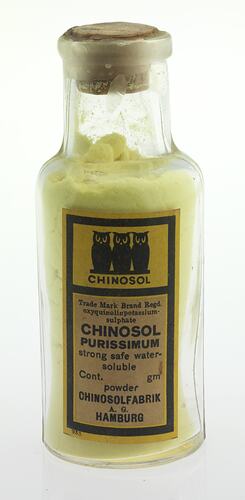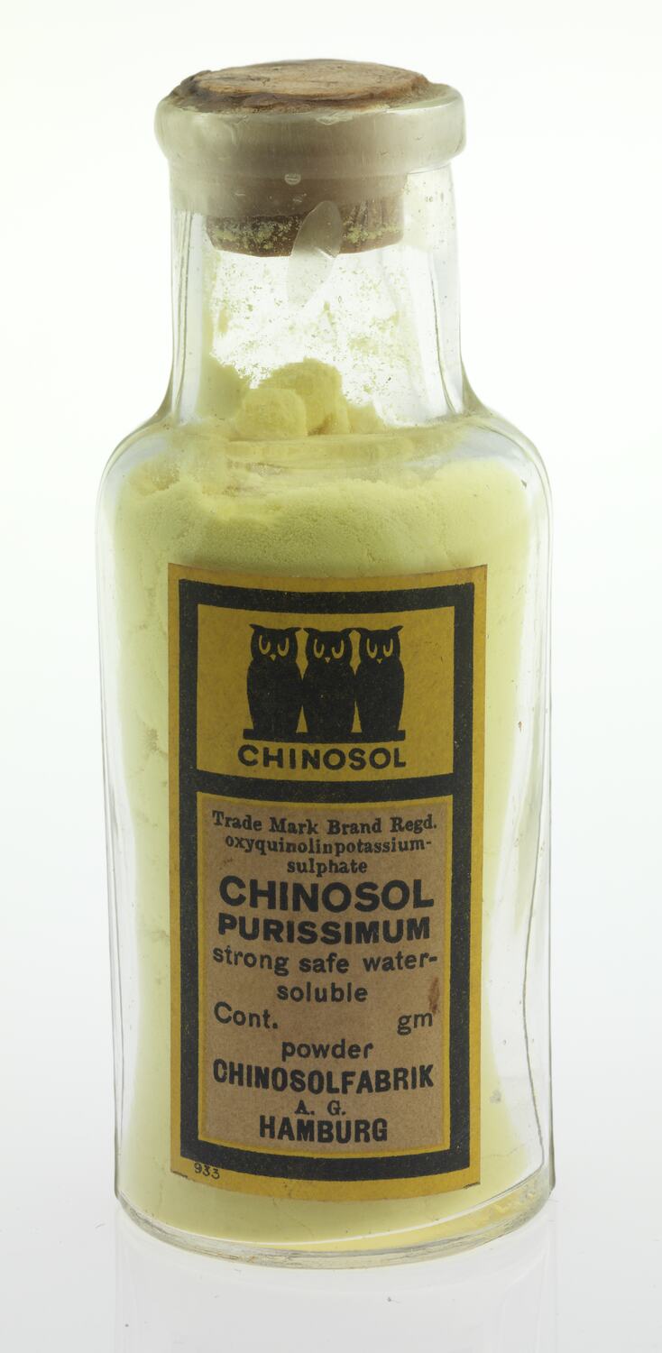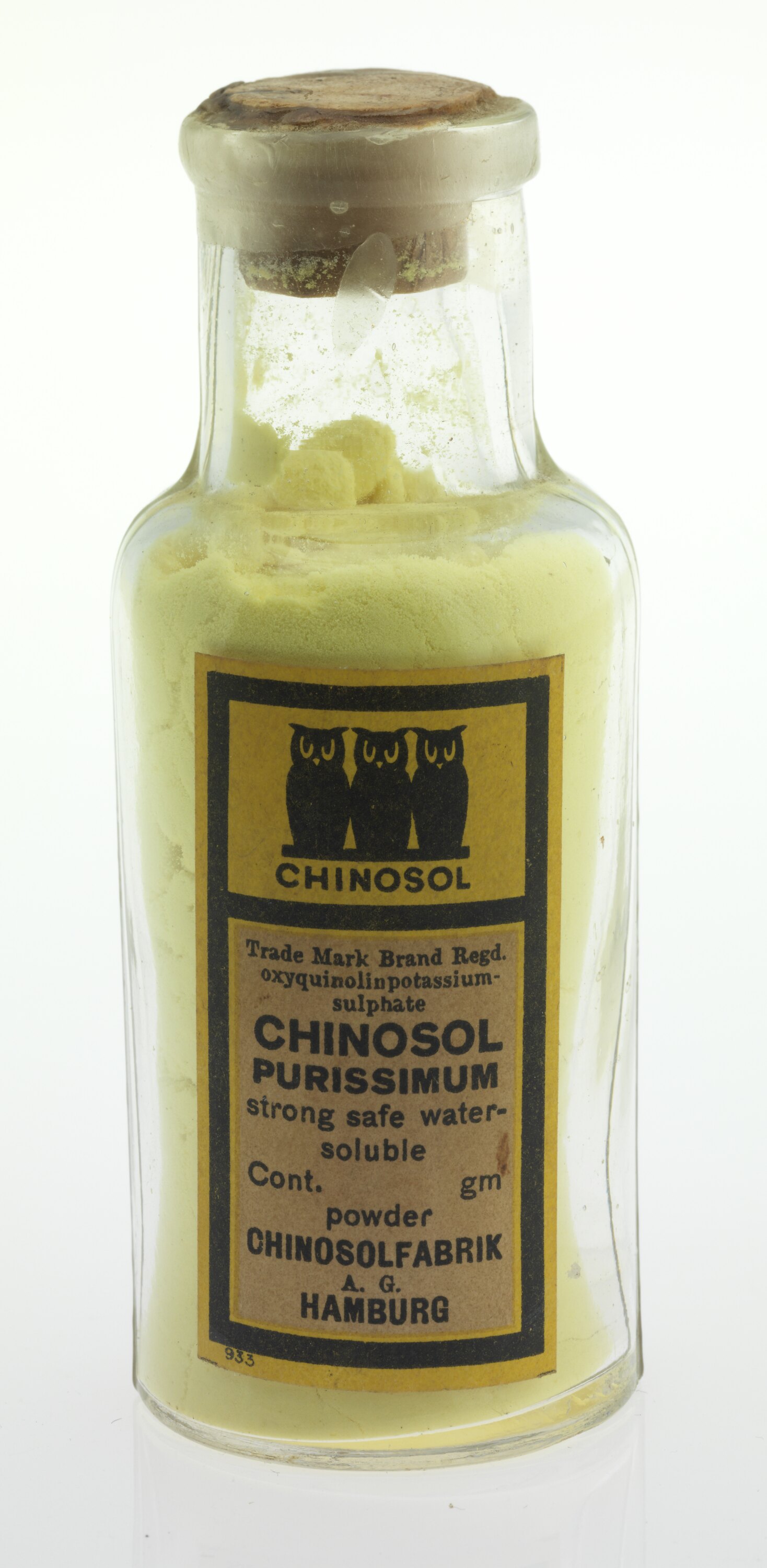 CHINOSOL / Trade Mark Brand Regd. / oxyquinolin potassium- / sulphate / CHINOSOL / PURISSIMUM / Strong safe water- / soluble / Cont. gm / powder / CHINOSOLFABRIK / A.G. / HAMBURG / 933