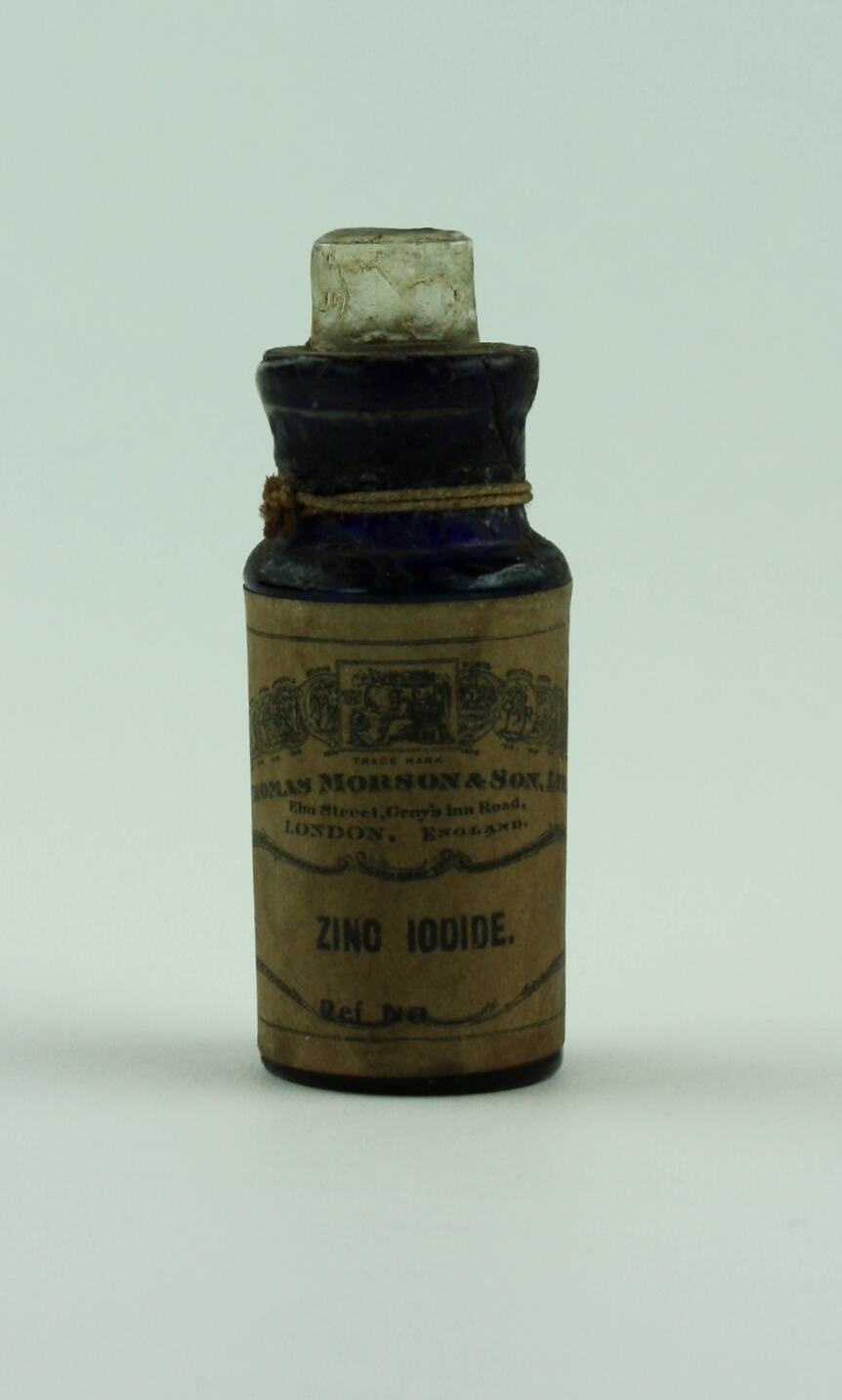 Bottle of zinc iodide by Thomas Morson & Son Ltd, used in a mental hospital pharmacy, Victoria Australia circa 1860. Zinc iodide was used as an antiseptic.