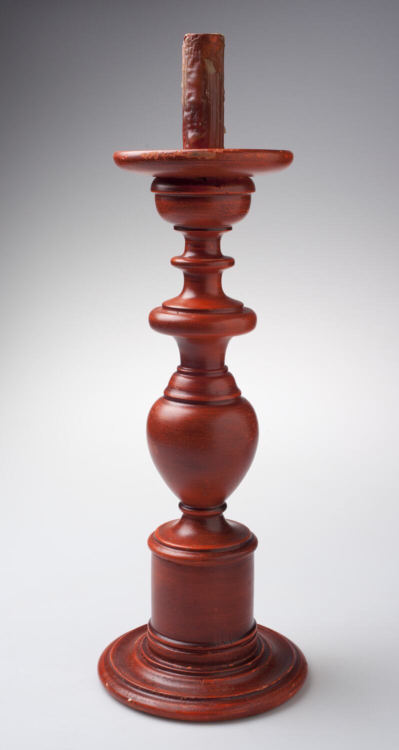 Turned wood pedestal with shallow bowl at top with a cylindrical piece of wood. This cylinder is coated with wax indicating that the pedestal was used as a candlestick. The item has been painted orange.
