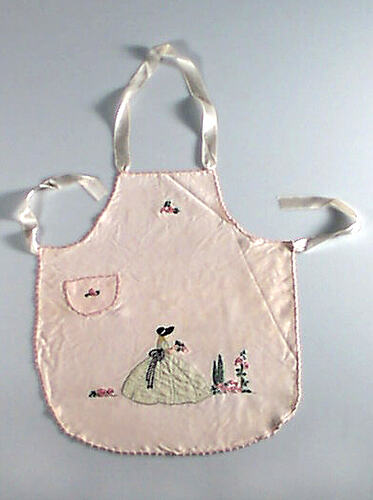 Childs' play apron. Pink nylon trimmed with pink crochet. Half circle breast pocket on left with crochet trim, and pink rose embroidery. Pink rose embroidery at top. Decorated with Dolly Varden applique and embroidery figure in green floral dress and black bonnet. Pink rose and green bush embroidery. White satin tie around neck and across back.