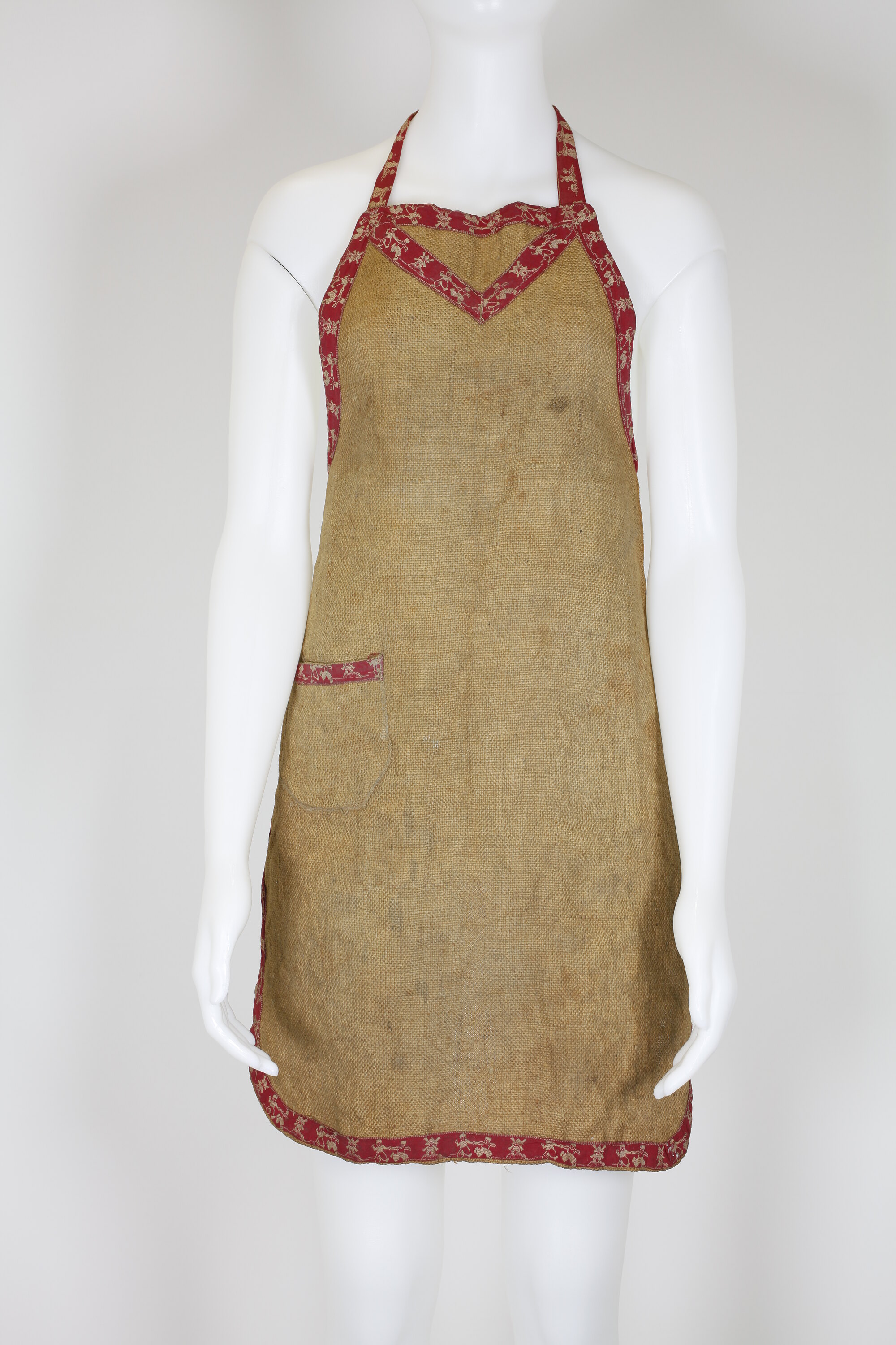 Hessian laundry apron made from a sugar bag with bib and right -hand pocket. A red and white tape, woven, depicting Dutch boys and windmills forms a border around the apron and across the top of the pocket. The tape is also used for neck and waist ties and for a vee of chevron design at the top of the bib.