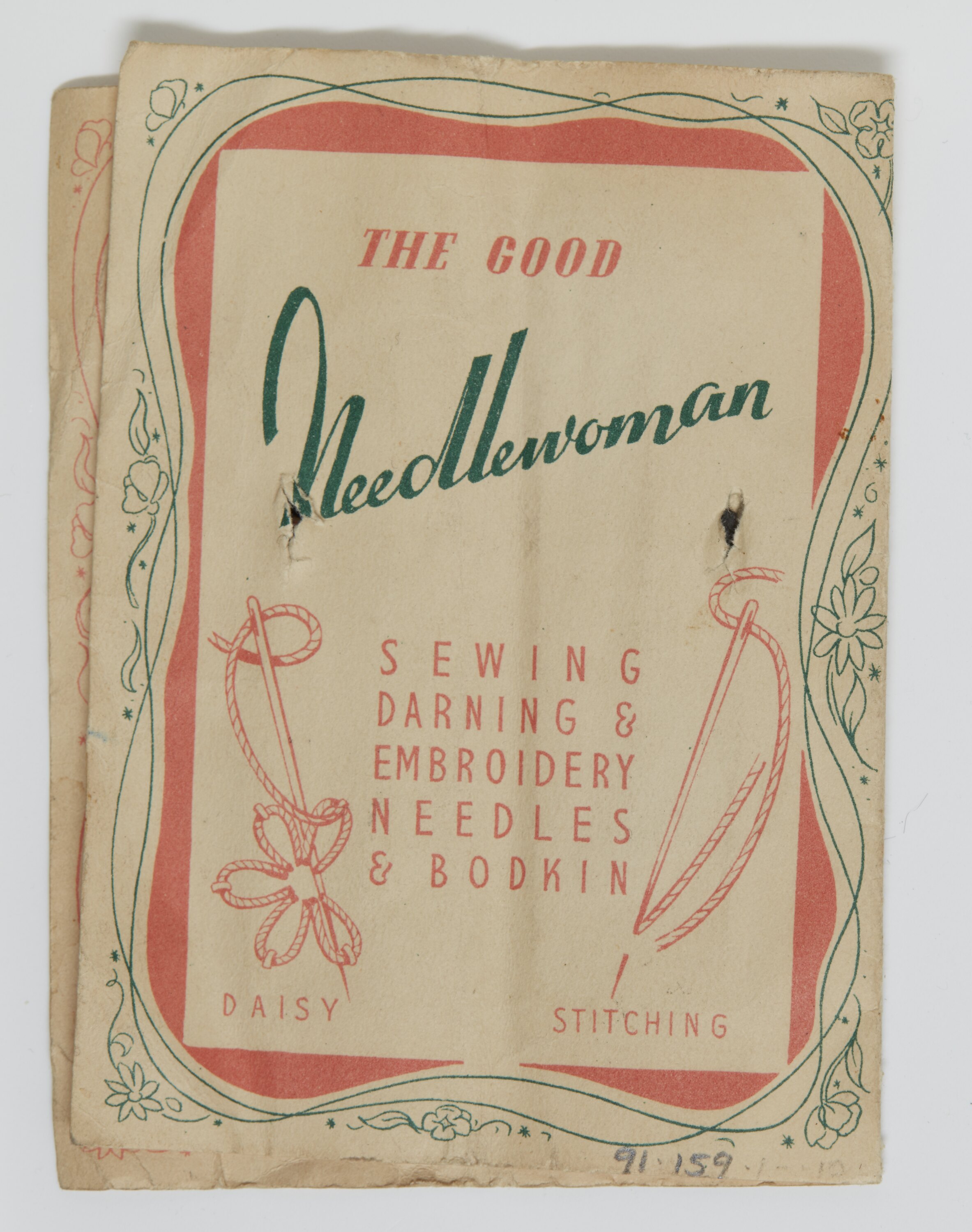"THE GOOD / NEEDLEWOMAN / SEWING / DARNING & / EMBROIDERY / NEEDLES / & BODKIN / MADE IN ENGLAND"; On the inside cover are diagrams for herring bone stitch and button holes.