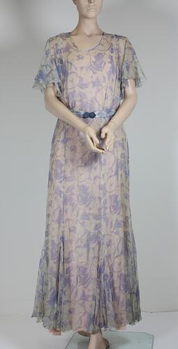 Blue and white floral printed crimped silk chiffon dress. High boat neckline, set in flounce sleeves. Used circa 1920. Belonged to Minnie Anderson, 'Mynda'. Molesworth Street, Kew. Probably worn with SH 88.899: pink silk petticoat.