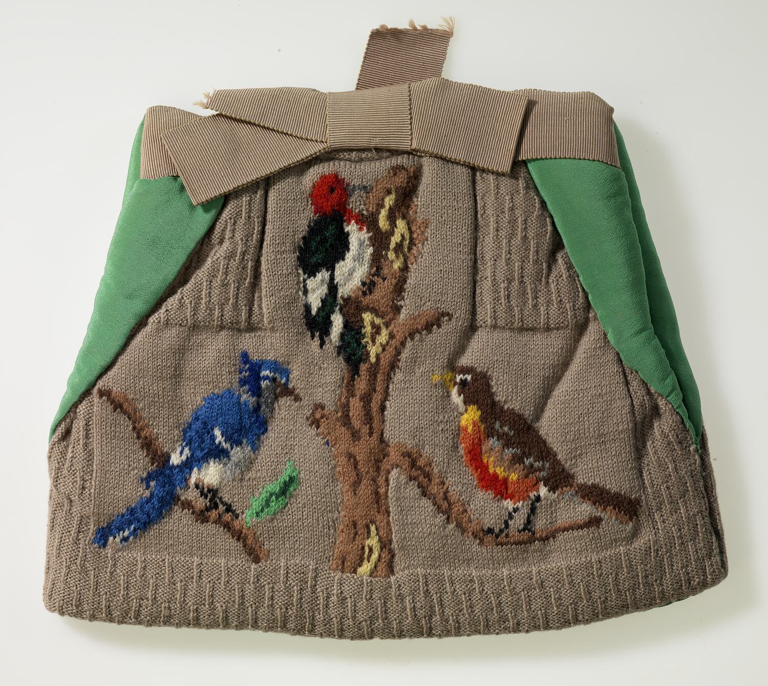 Knitted tea cosy. Brown wool with green silky material lining. Brown nylon ribbon and bow on top. One side of cosy is decorated with tree and woodpecker, kingfisher and robin. The other side is decorated with unknown black and yellow bird sitting on a branch. Sides are stitched from half-way down to allow for handle and spout of tea pot. The knitting work is of very fine quality.