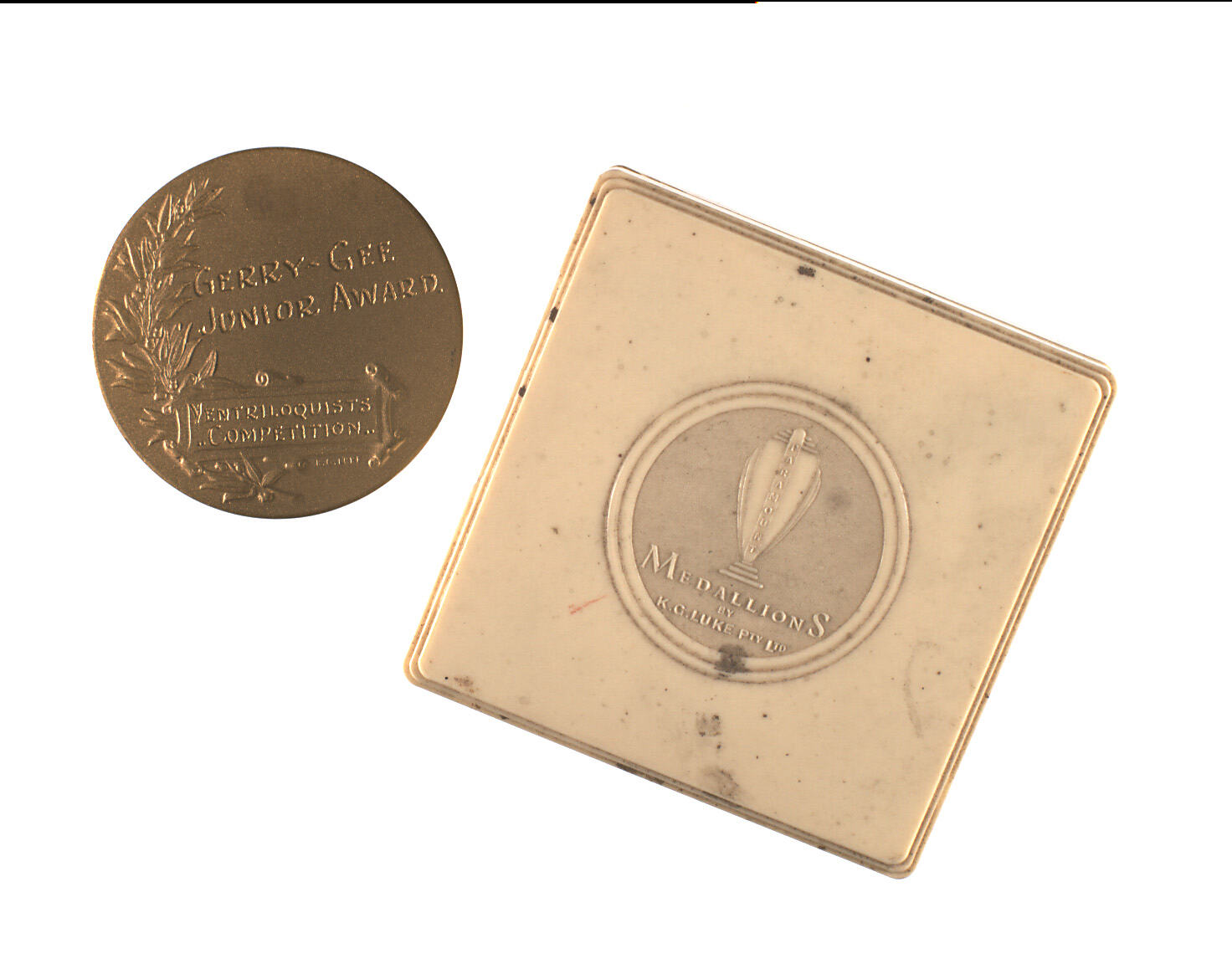 Medal engraved: Presented to/ /by G.T.V. 9 and/L.J. STERNE DOLLS/ ..1960. Engraved on reverse: GERRY GEE/JUNIOR AWARD/VENTRILOQUIST/COMPETITION. Inscription on medal case: MEDALLIONS/BY/K.C. LUKE PTY. LTD. On base of case: CASE CRAFT/CAT. No. 102. Gold printing inside case: K.C. LUKE/PTY.LTD./MEDALLISTS/MELBOURNE.