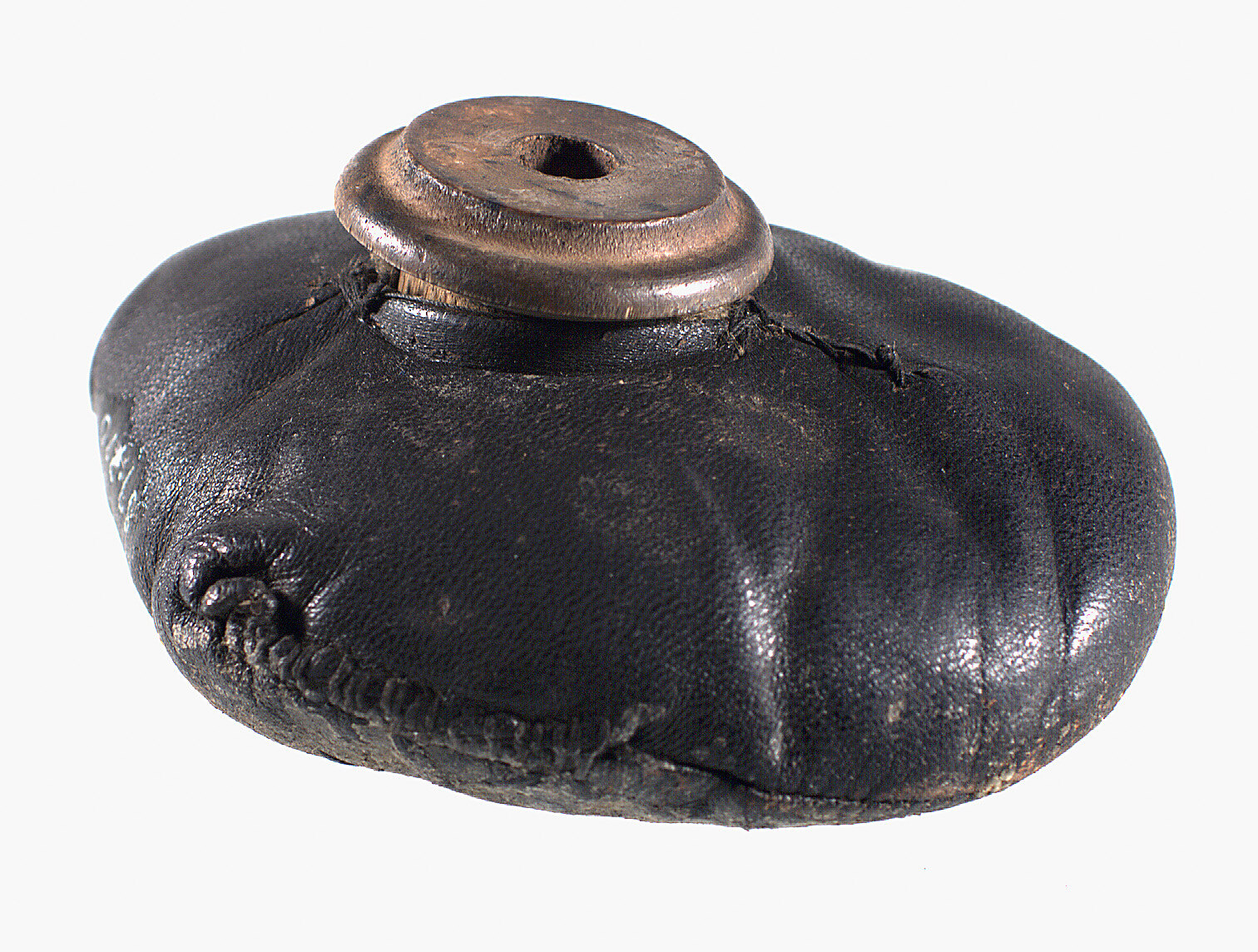 Home-made sewing palm, made from scrap of black leather, with wooden cotton reel handle, stuffed with unknown material. Made and used at Simpson's Gloves Pty Ltd, Richmond, 1970s.
