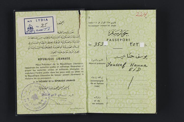 Lebanese passport including identity photograph issued in 1965, belonging to Youssef Eid and brought with him when he migrated to Australia in 1965.