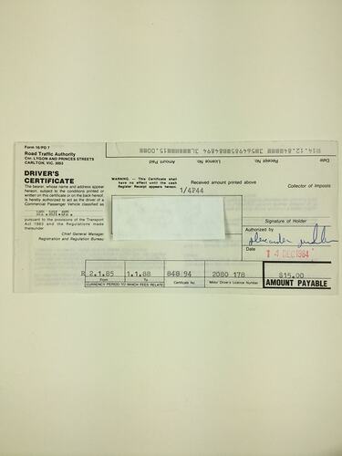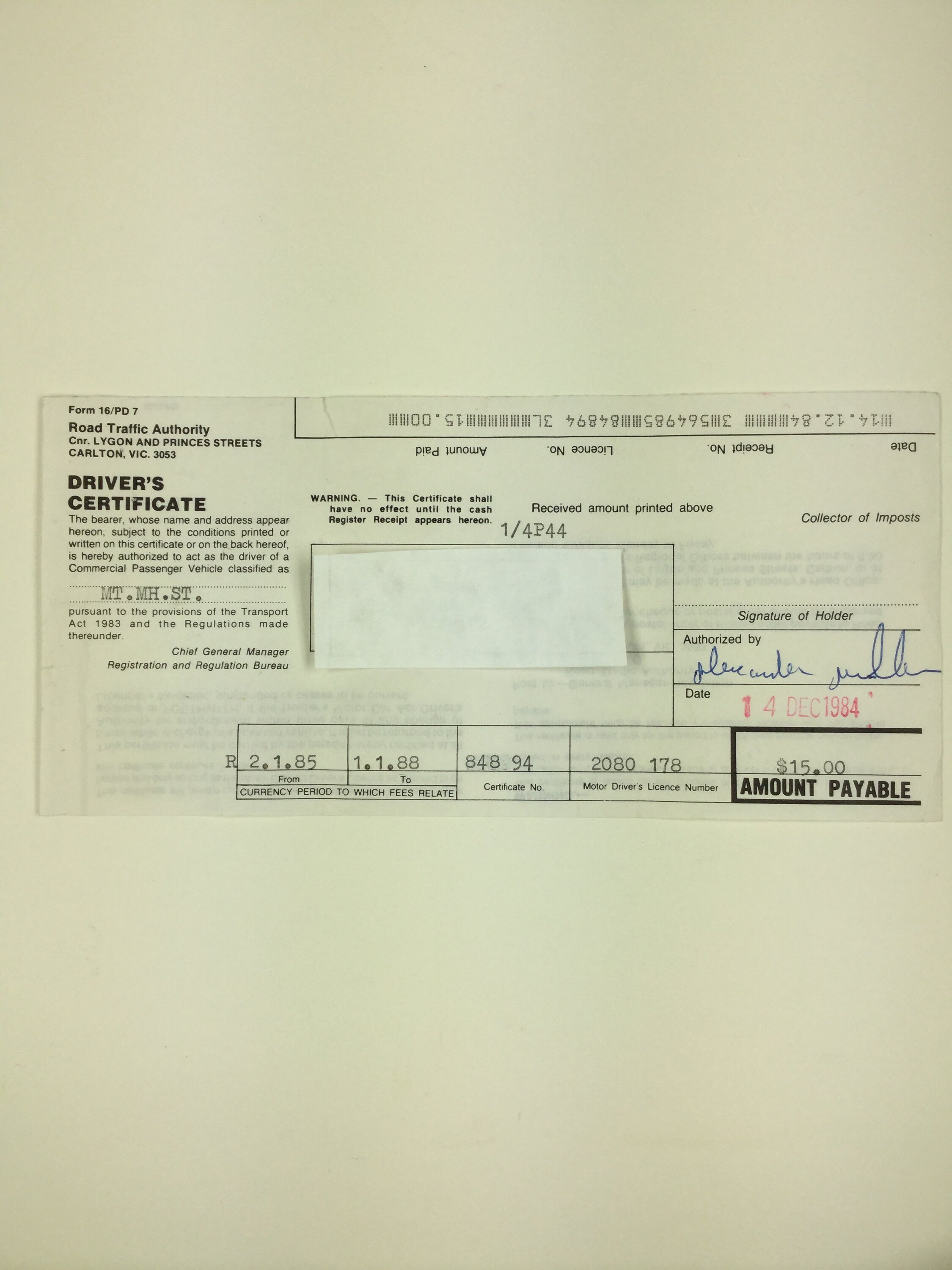Taxi driver's certificate issued by the Road Traffic Authority on 14 December 1984 for Romanos Eid to drive taxis in Melbourne from 2 January 1985 till 1 January 1988. This item relates to the certificate cover [HT 56781].