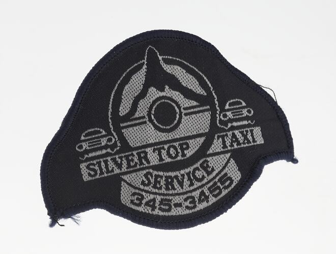 Embroidered badge with Silver Top Taxi Service insignia, part of Silver Top Taxi uniform worn by Romanos Eid while driving taxis in Melbourne during the 1990s.