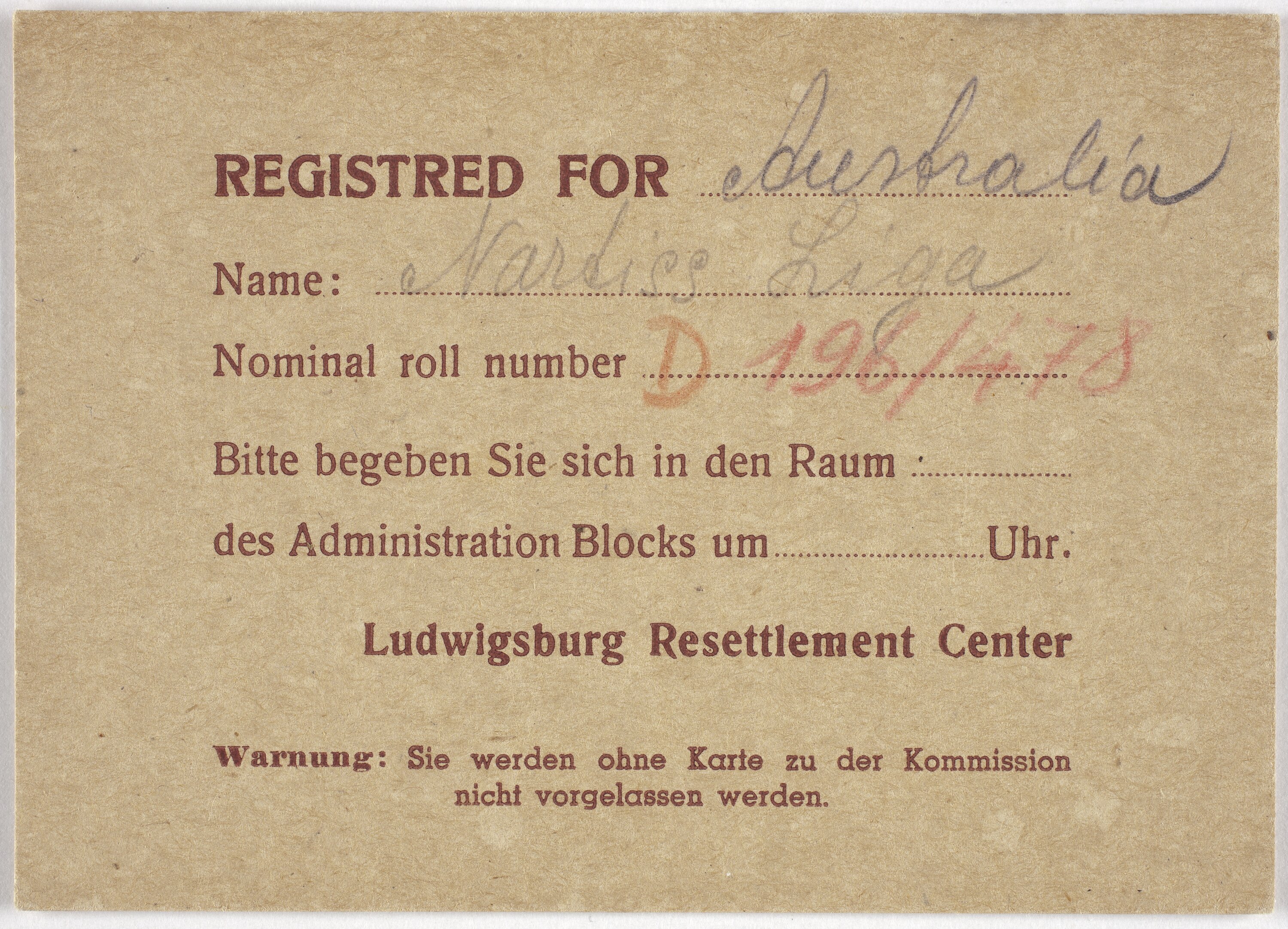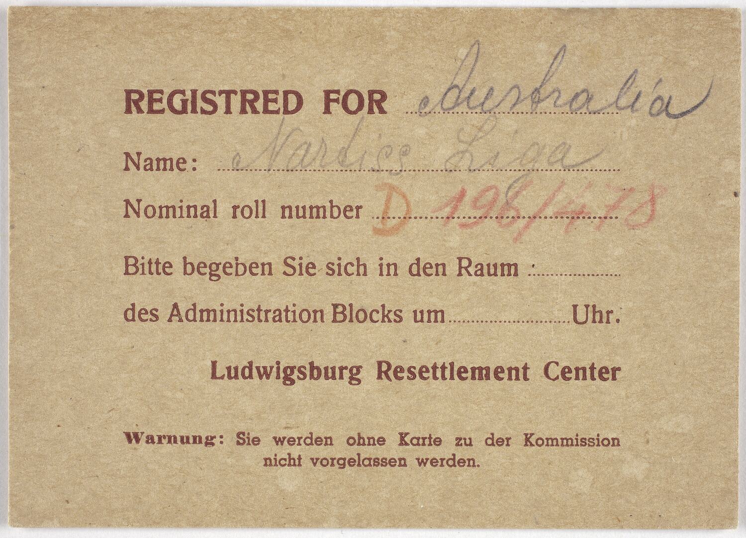 Card issued to Liga Nartiss by the Ludwigsburg Resettlement Centre, circa 1948-1949. The card states she has registered for Australia as a destination country.
