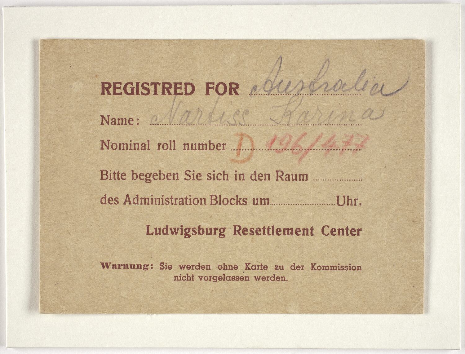 On Card: 'REGISTERED FOR Australia/Name: Nartiss Karina/Nominal roll number: D196/477 [text in German]