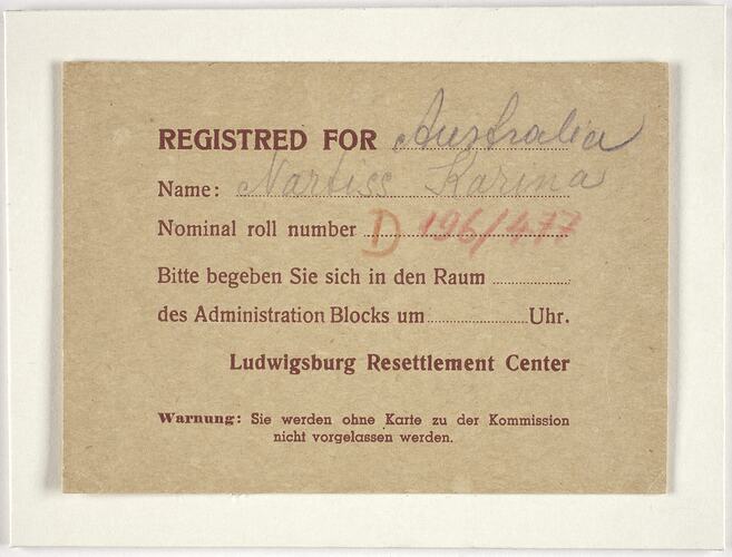 Registration Card issued to Karina Nartiss by the Ludwigsburg Resettlement Centre, circa 1948-1949. The card states she has registered for Australia as a destination country.