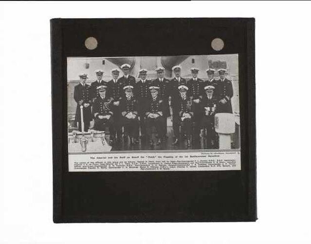 Group portrait of Rear-Admiral Sir Frederick L. Field (1871-1945) with the officers of his staff in front of one of the twin 15-inch gun turrets of the Royal Navy battlecruiser HMS Hood. Following distinquished service during World War I, Field was promoted to Rear Admiral in 1919 and appointed Third Sea Lord and Controller of the Navy the following year. In 1923, he was knighted and appointed to the command of the Special Service Battlecruiser Squadron, with HMS Hood as flagship. Between November 1923 and September 1924, he led the squadron on an "Empire Cruise" visiting all major Australian ports, including Port Melbourne, from 17th - 25th March 1924. Following his return from the tour he was promoted to Vice Admiral on 26 September 1924. He was promoted to full Admiral on 5 April 1928, and later served as First Sea Lord of the Royal Navy from1930-1933, before retirement.