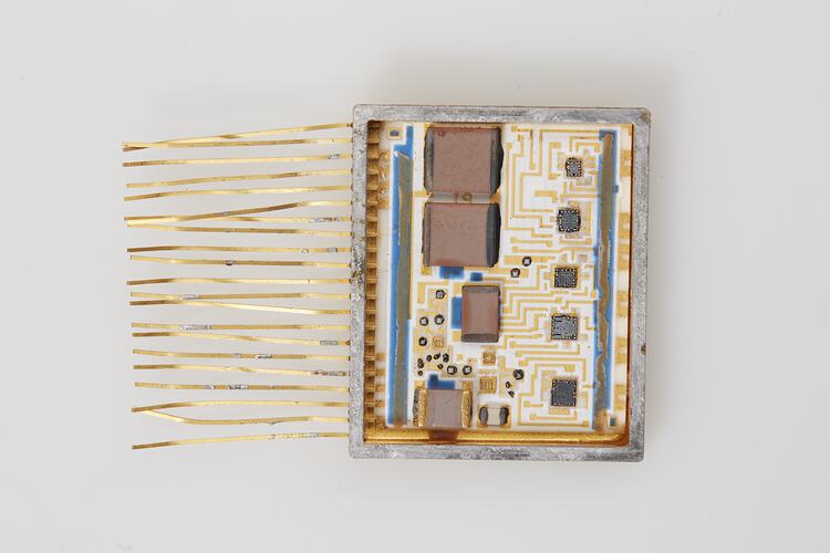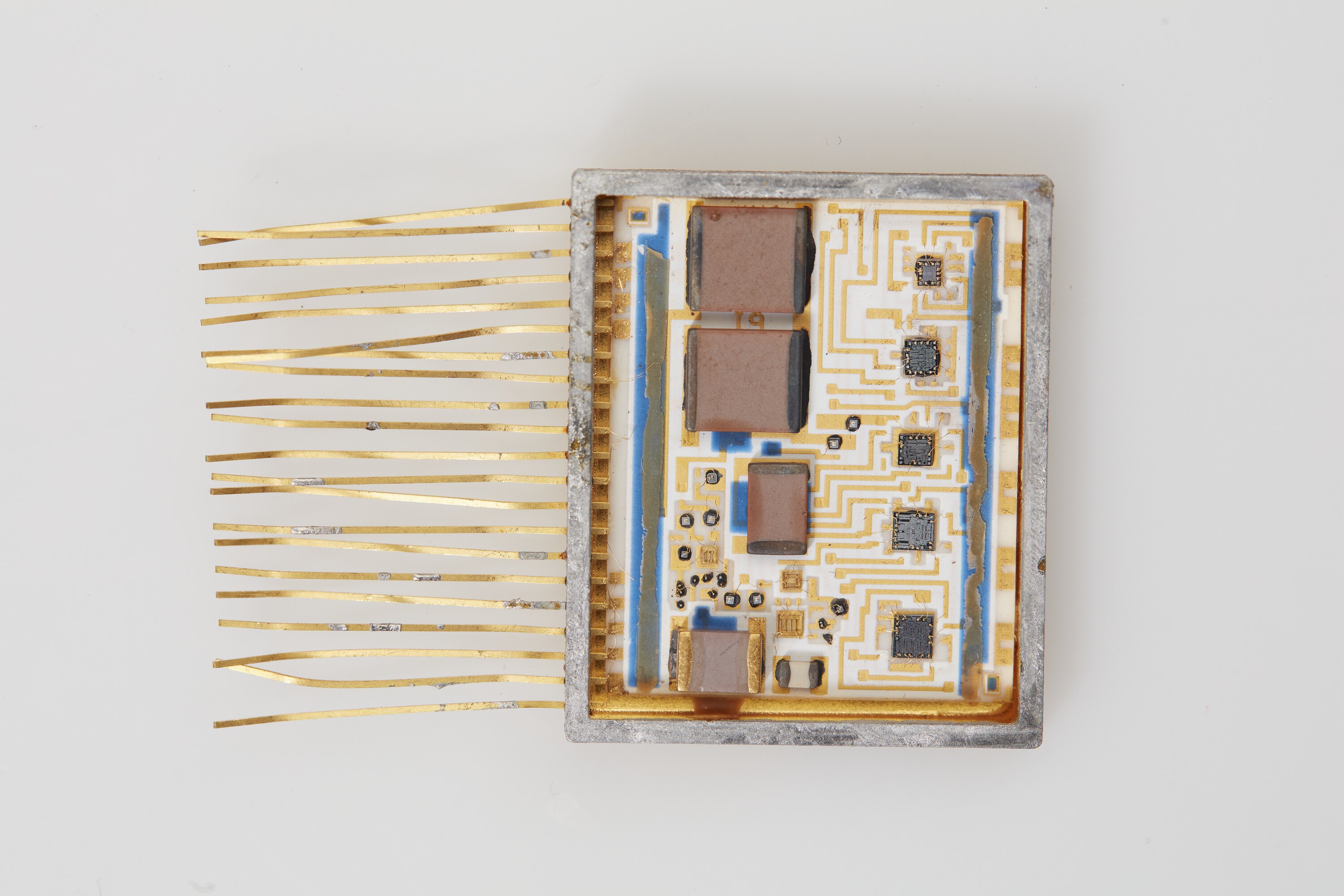 A single circuit. A five channel stimulator board and package, ready for installation into the 'gold box' prototype bionic ear implant, University of Melbourne, 1977