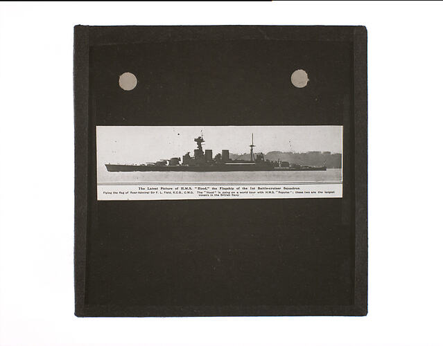 Side view of the Royal Navy battlecruiser (42,100 tons) HMS Hood. Following the Battle of Jutland in 1916, considerable extra armour was added to new capital ships under construction including Hood which was launched at the John Brown & Co. yard at Glasgow in August 1918. The four Brown-Curtis shaft-geared turbines used Michell thrust bearings, the invention of Melbourne engineer A.G.M. Michell. Following completion in 1920, Hood was the largest warship of the Royal Navy and completed a world cruise in 1924 with the Special Service Squadron during which she visited Australia including a stop at Melbourne in March 1924. During the World War II Hood served with the Home Fleet and took part in the hunt for the German battleship Bismarck in May 1941. On 25 May 1941 Hood was hit by shells from Bismarck and her escort the heavy cruiser Prinz Eugen and blew up leaving just three survivors of her 1418 crew. A number of Australians serving on Hood at this time were lost including RAN Ordinary Seaman Ian Startup of Williamstown in Melbourne, John Shannon, George Hall and David Hall.