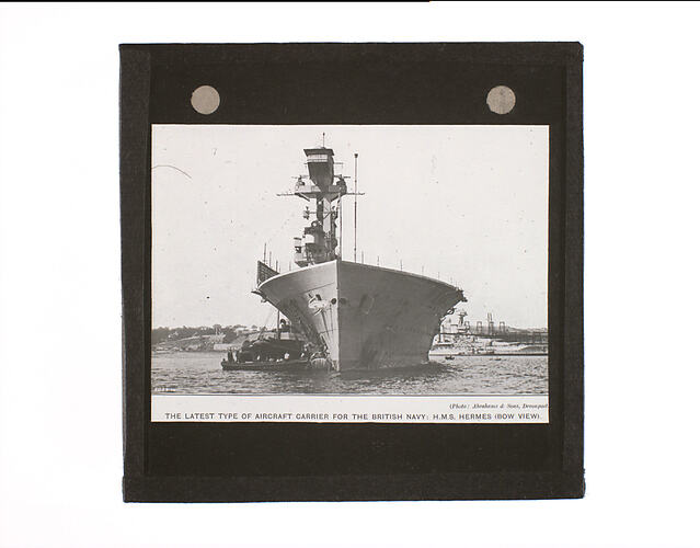 Bow view of the Royal Navy aircraft carrier HMS Hermes. Commissioned in 1923, HMS Hermes was the first Royal Navy aircraft carrier to be designed and built as such from the outset as opposed to previous conversions of existing hulls. Along with the Australian destroyer HMAS Vampire, Hermes was sunk off the coast of Ceylon (Sri Lanka) on 9 April 1942 by Japanese carrier-based aircraft.