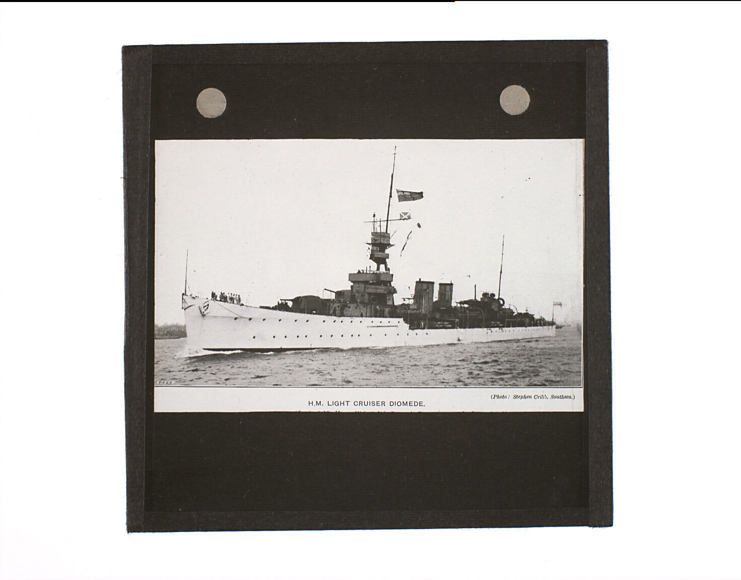 Port side view of the Royal Navy D class light cruiser HMS Diomede. Commissioned in 1922, HMS Diomede served with the New Zealand Division of the Royal Navy from 1926 to 1935. After serving with the Royal Navy during World War Two, Diomede was scrapped at Dalmuir in 1946.