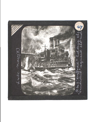 Part of a collection of magic lantern slides relating to British naval history originating from the St John's Home for Boys. These slides were produced in Melbourne after the First World War with images from books and other sources. They are believed to have been used to illustrate lectures to the children in St John's Homes. Several of the slides are marked with the name 'Boreham'. This may indicate a link to Reverend Frank William Boreham (1871-1959), a noted Baptist writer and preacher who used lantern slides to illustrate talks in Melbourne and Tasmania however St John's was an Anglican institution.