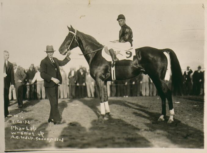 Black and white photographic print of Phar Lap, with jockey and suited man in front, crowd gathered behind rope in background. Shadows indicate late evening. Writing in white ink on bottom left hand corner. The horse's saddle cloth shows the number 9.