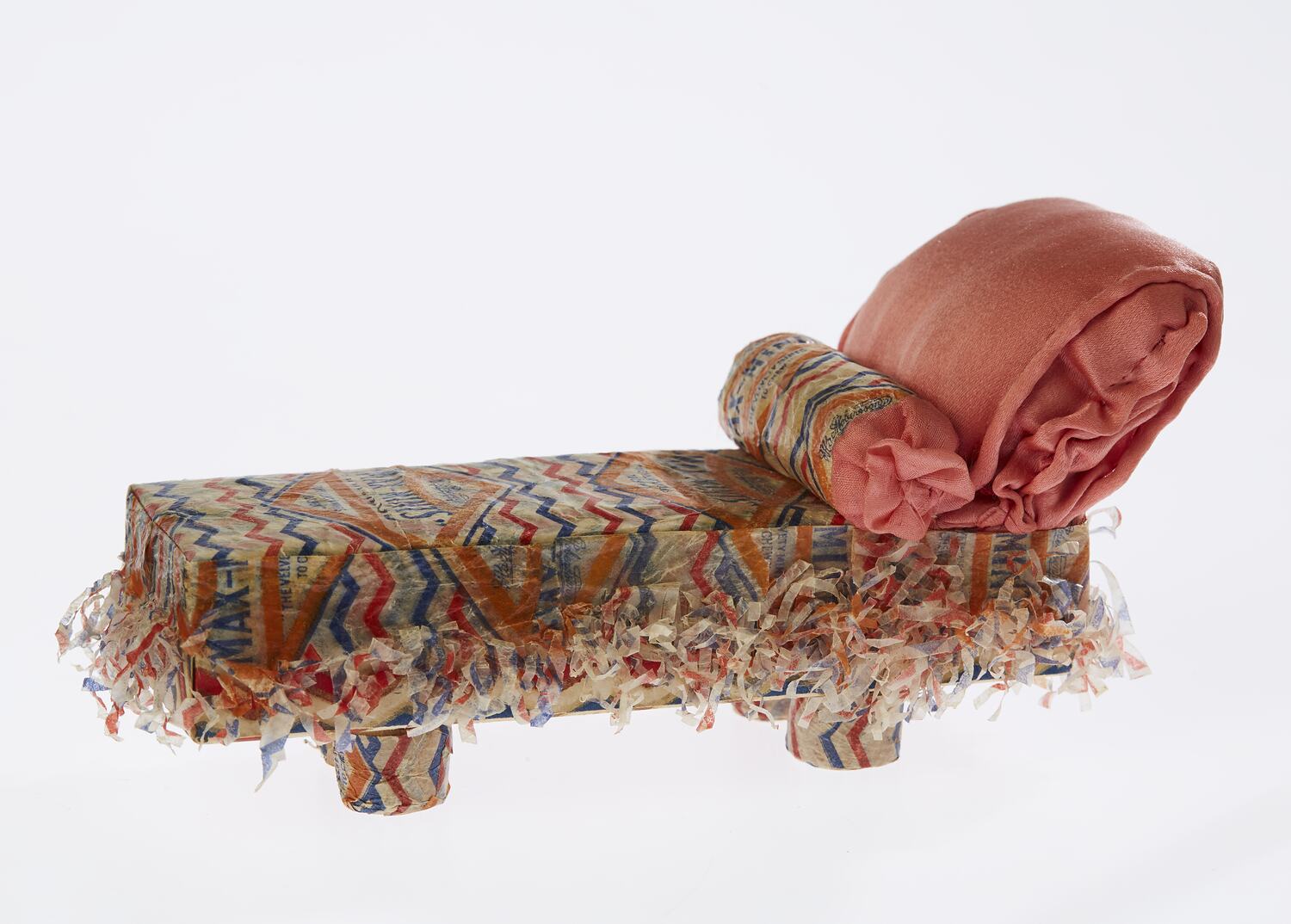 Toy chaise longue made by Mrs Johanna Harry Hillier, nee Gyles, circa 1929-1935, in which was stored toys made from MacRobertson's Max Mint wrappers of waxed paper, printed with a diamond shape in blue and orange with a background of red and blue zig-zag lines.