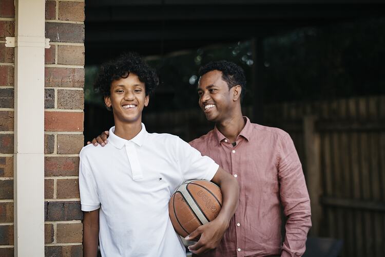 Digital photograph depicting father Abdi Aden and son Kofi Aden at home in the northern suburbs of Melbourne, Victoria, during the COVID-19 pandemic in November 2020. They are pictured standing at their front door, wearing protective face masks.