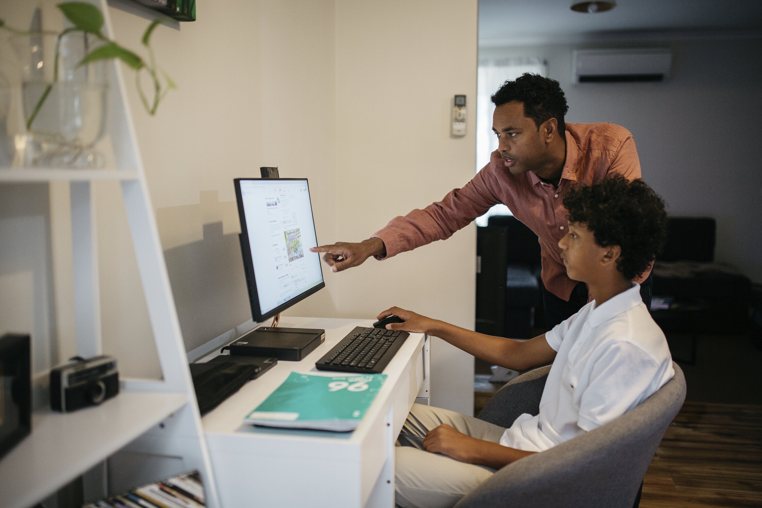 Digital photograph depicting 13-year-old Kofi Aden and his father Abdi Aden at home in the northern suburbs of Melbourne, Victoria, during the COVID-19 pandemic in November 2020. They are pictured sitting at the family's home computer, where Kofi had spent the past few months home-schooling and writing a daily 'Gratitude Journal' during COVID-19 lockdowns and 'Stay at Home' restrictions. In this photograph Abdi is pictured helping Kofi upload one of his journal entries onto the Facebook group, 'the Kindness Pandemic.'