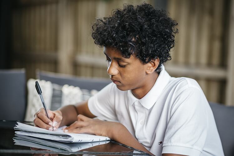 Digital photograph depicting 13-year-old Kofi Aden at home in the northern suburbs of Melbourne, Victoria, during the COVID-19 pandemic in November 2020. He is pictured sitting in his backyard writing his A4 'Gratitude Journal.'