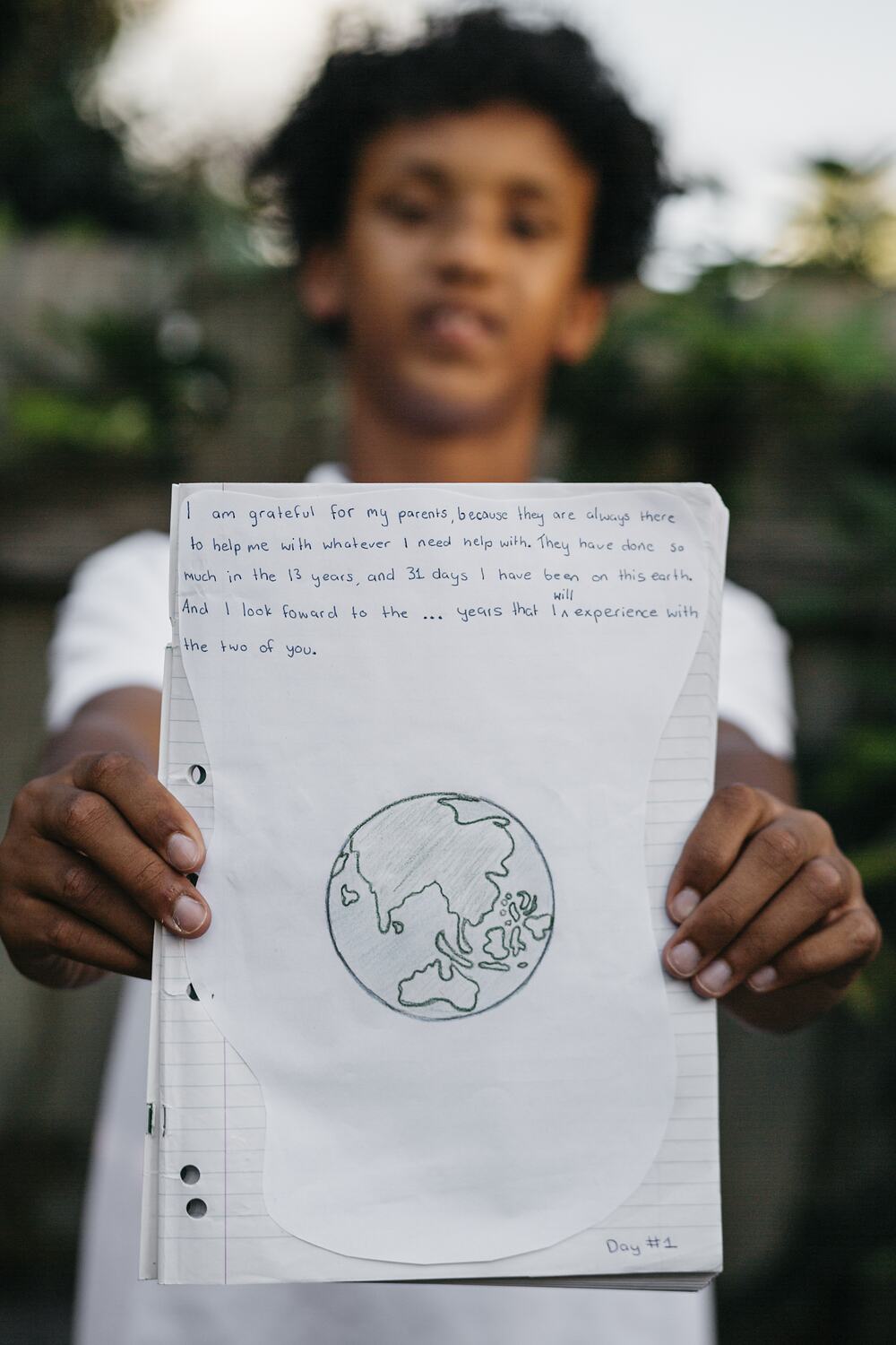 Digital photograph depicting 13-year-old Kofi Aden at home in the northern suburbs of Melbourne, Victoria, during the COVID-19 pandemic in November 2020. He is pictured holding his 'Gratitude Journal', which is opened to the first entry. It reads: