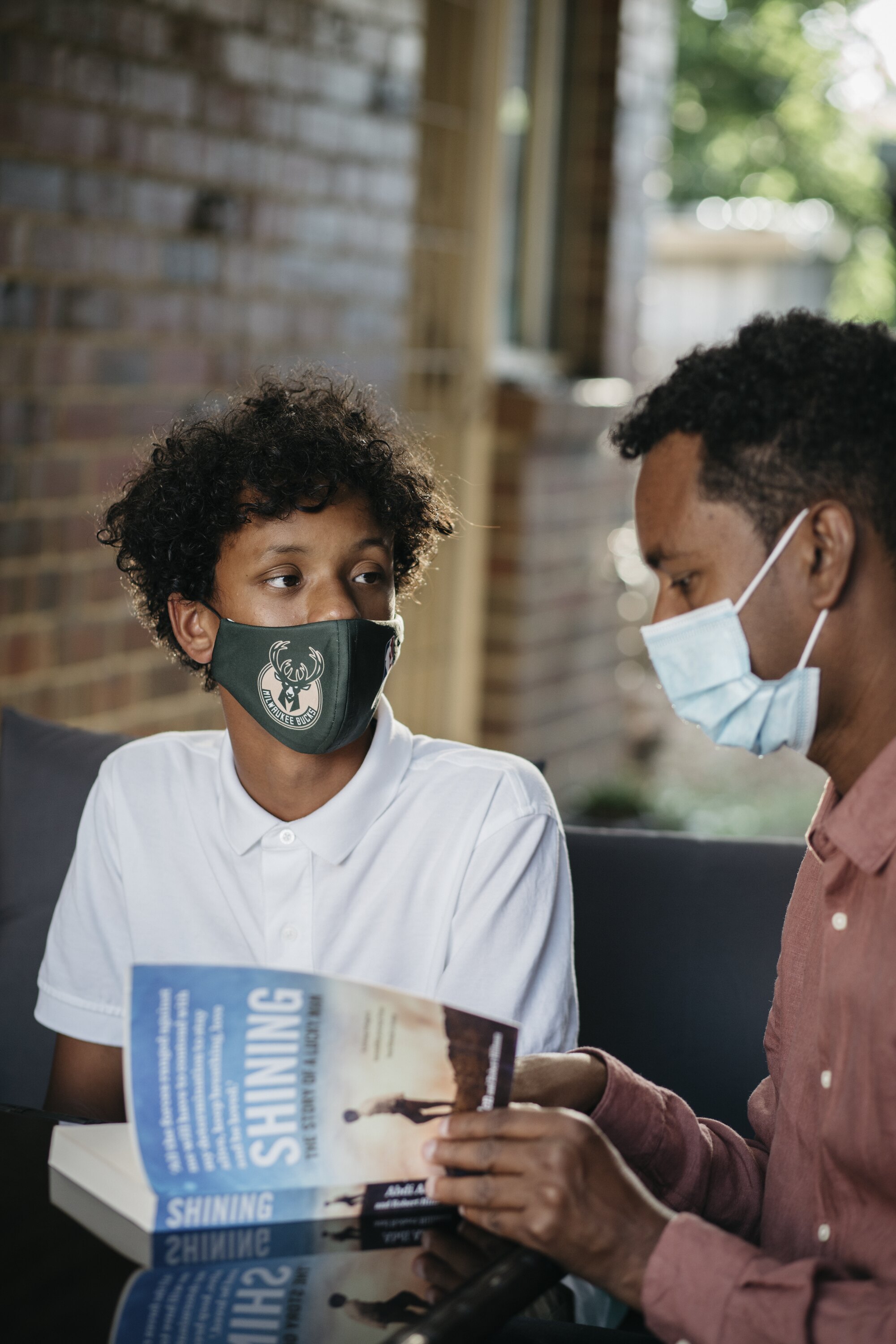Digital photograph depicting 13-year-old Kofi Aden sitting with his father Abdi Aden at home in the northern suburbs of Melbourne, Victoria, during the COVID-19 pandemic in November 2020. Abdi is pictured showing his son his biography, 'Shining: The Story of a Lucky Man' that was published in 2015 and details Abdi's experience of living through civil war in Somalia and seeking asylum in Australia in the early 1990s.