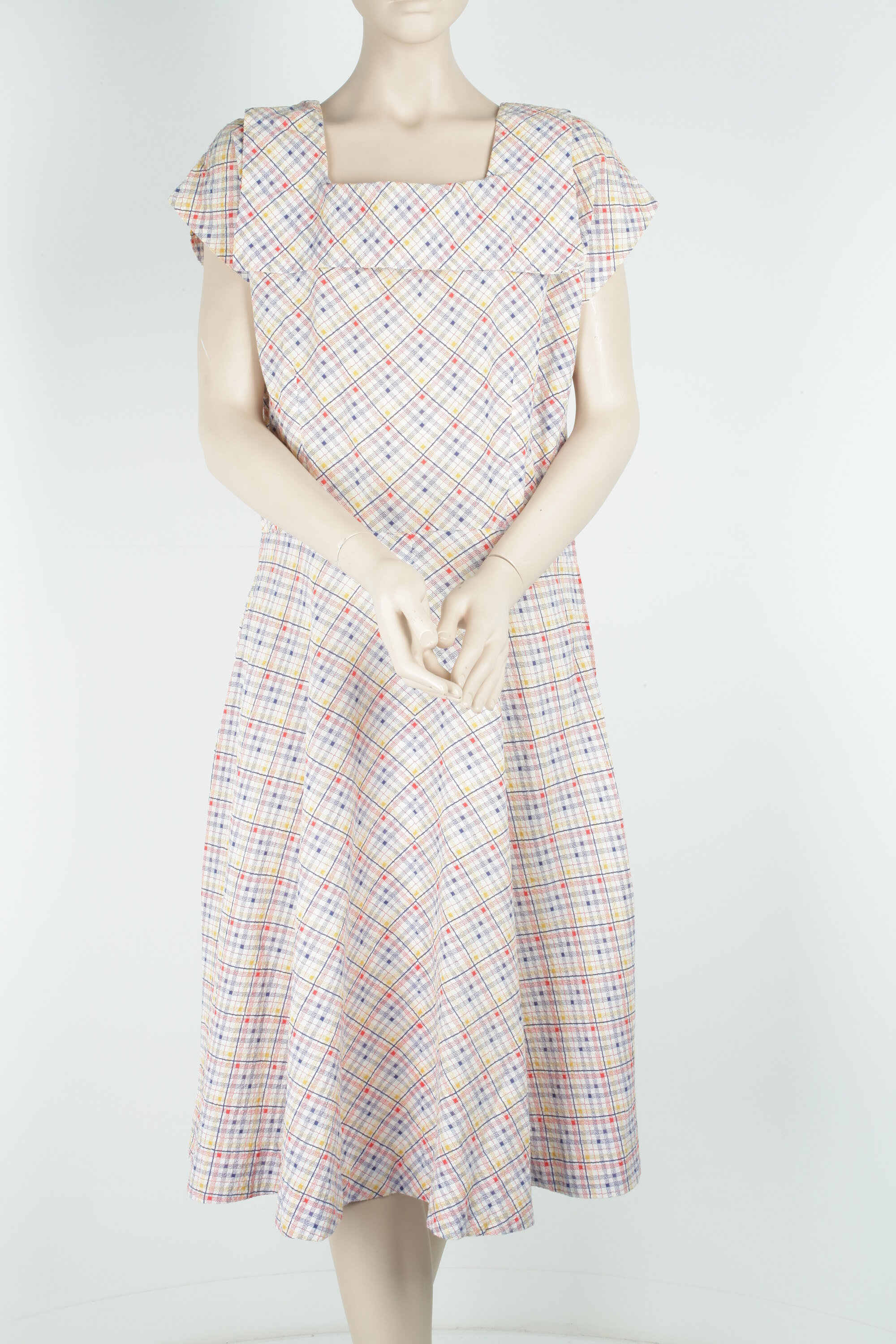 Square necked, sleeveless waisted housedress made from white/yellow/blue and red checked cotton plisse. Metal zip closing. Handsewn hem.